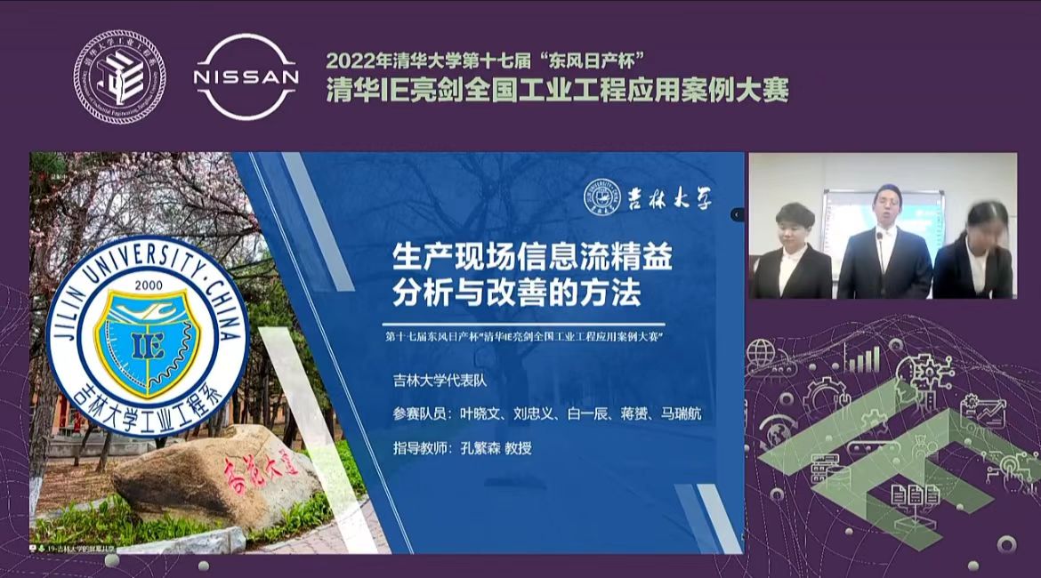 On 30 October, the 17thDongfeng Nissan Cup “Tsinghua IE Sword” National Industrial Engineering Case Study Competition (Special Competition for Industrial Engineering Innovation Methods of China Innovation Methods Competition) was hosted by the Industrial Engineering Teaching Steering Committee of the Ministry of Education, the National Graduate Education Steering Committee for Professional Engineering Degree, and the Department of Industrial Engineering of Tsinghua University. In the Competition, two teams from the School of Mechanical and Aerospace Engineering of Jilin University won one national grand prize and one first prize (ranking first), respectively. Specifically, the team (members: Li Qiang, Han Zeping, Zhan Jiang, Li Jialin, and Xi Jialu) won the grand prize in the university category with their entry “Digital Solutions to Electrical Assembly Manufacturing System Featuring Intelligent Manufacturing: Case Study of S Company”, and its total score ranked second among all entries nationwide. Another team (members: Ye Xiaowen, Liu Zhongyi, Bai Yichen, Jiang Yun, and Ma Ruihang) won the first prize in the university category with their entry “Lean Analytics and Improvement Methods of Information Flows on the Production Site”, and its total score ranked fourth among all entries nationwide.