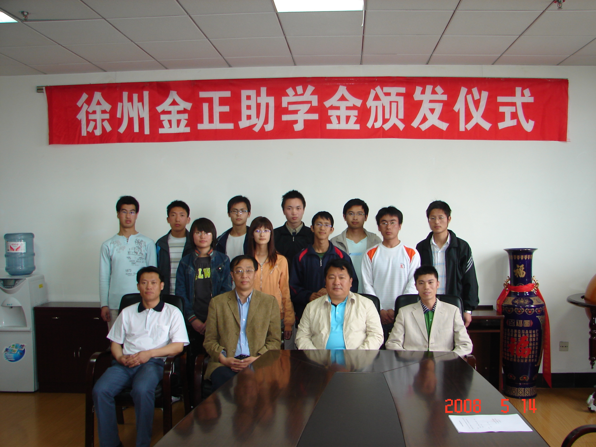 2008年5月14日下午14:00,徐州金正助学金颁发仪式在吉林大学南岭校区逸夫机械材料馆517会议室成功举行。
