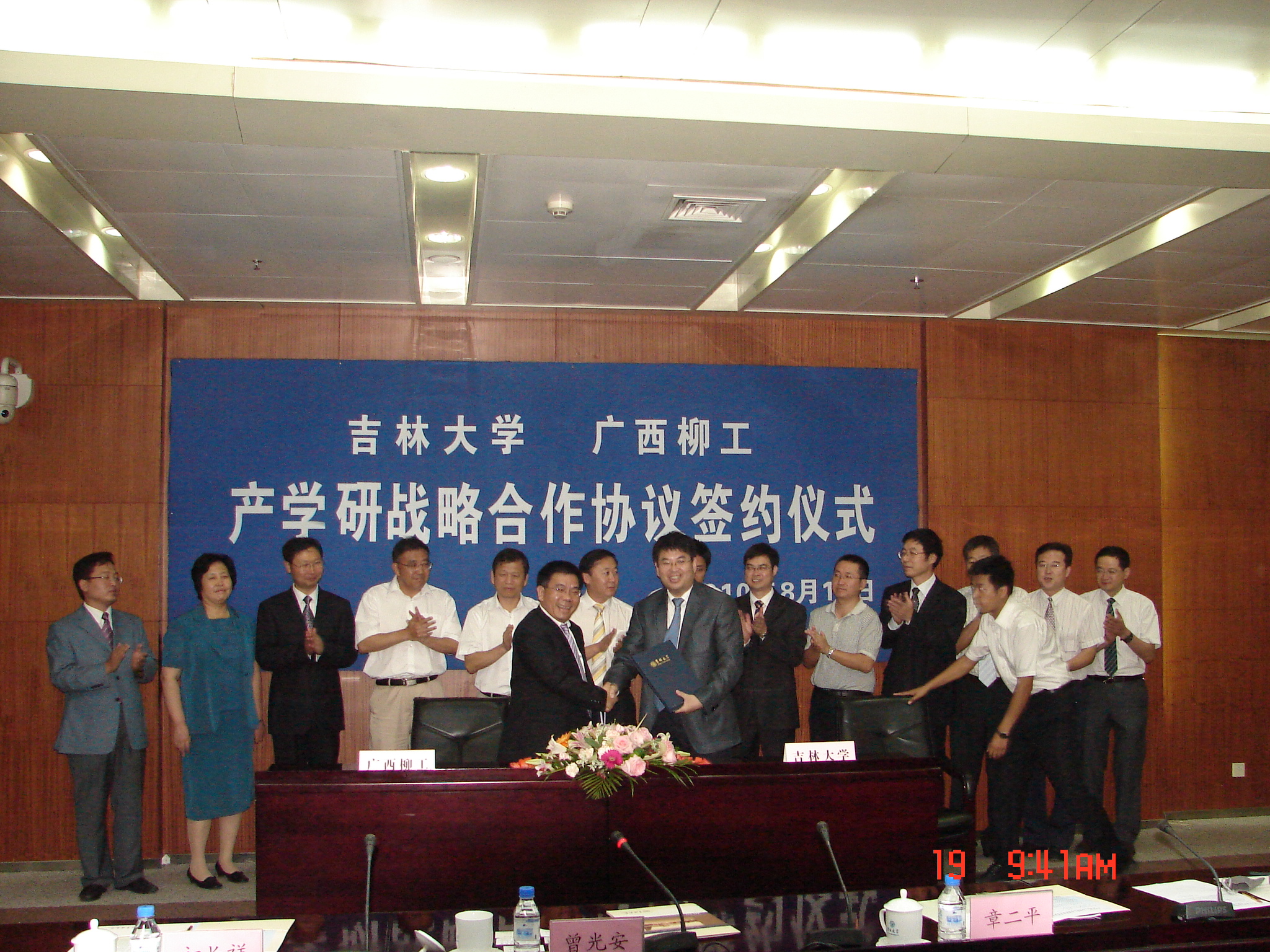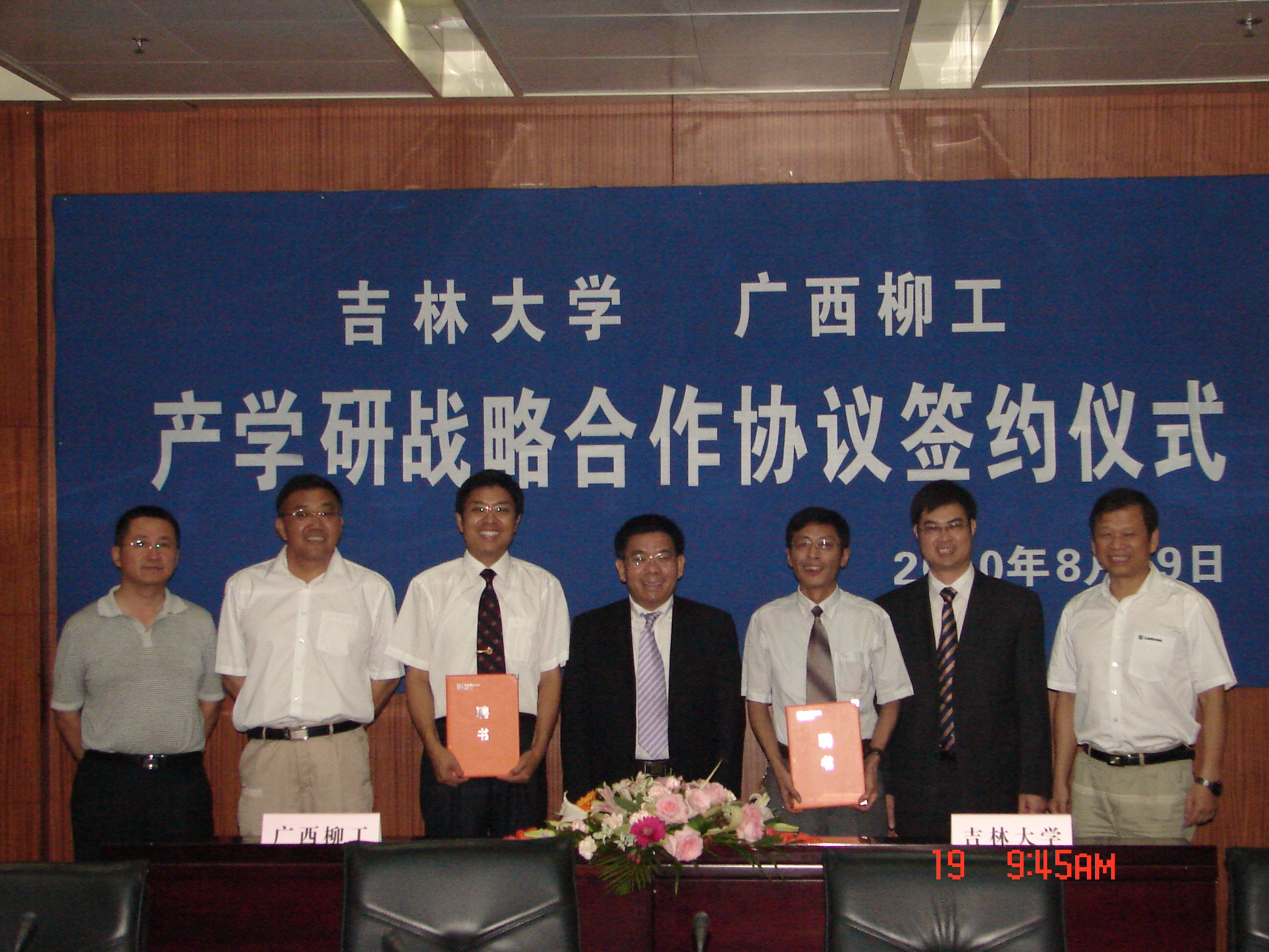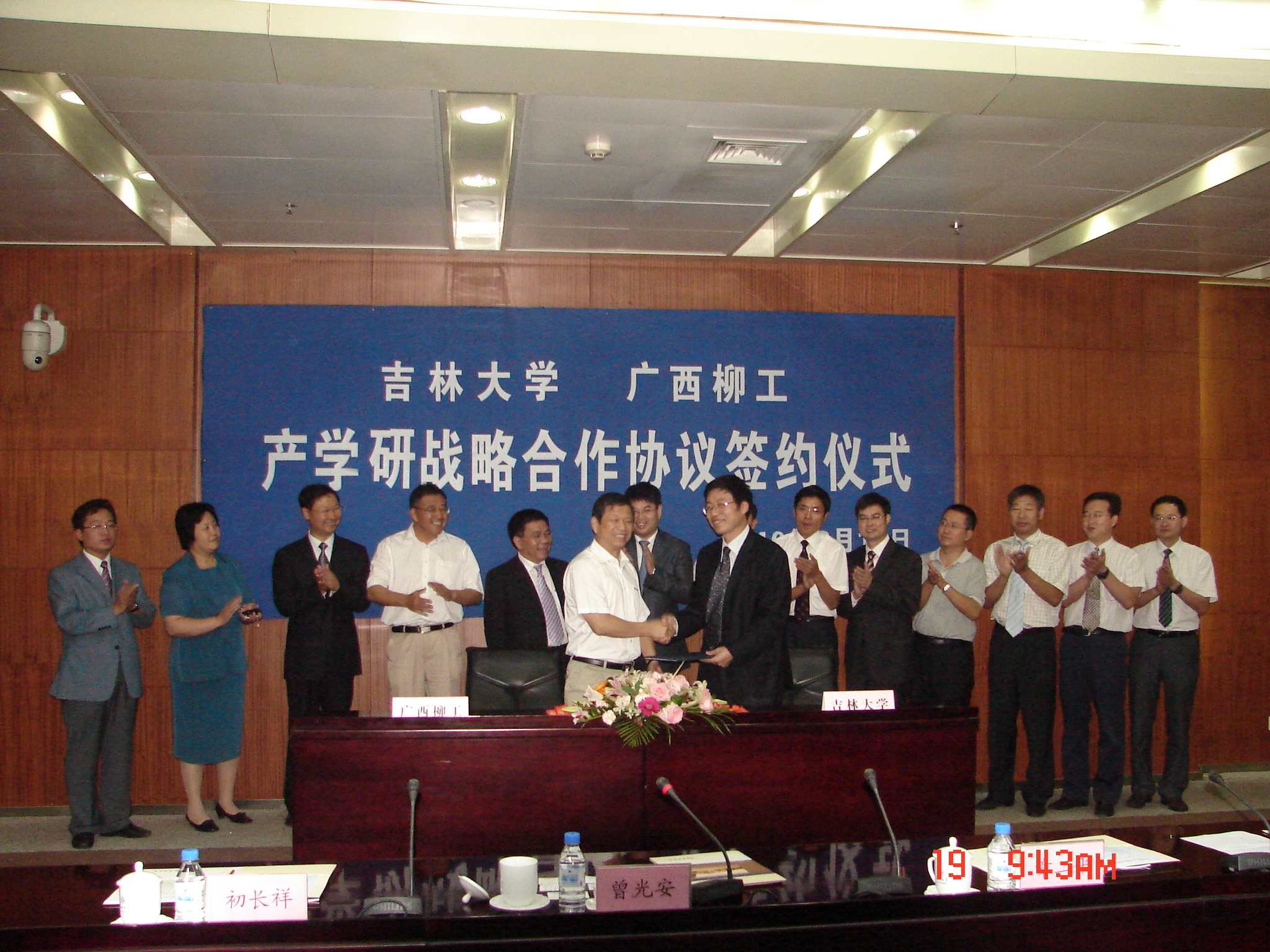 2010年8月19日上午9:00整,吉林大学与广西柳工机械股份有限公司产学研战略合作协议的签约仪式在吉林大学东荣大厦第一会议室隆重举行。吉林大学校长展涛教授、常务副校长赵继教授、研究生院常务副院长赵丁选教授、校长办公室刘桂云主任、学生工作部冯正玉部长、研究生管理处康永刚处长、机械学院院长杨兆军教授、机械学院党委书记王国强教授、科技处张涛副处长、专利与成果转化办公室冯昌盛主任、广西柳工总裁曾光安先生、总工程师章二平先生、新技术总监初长祥先生、人力资源总监吴荫登先生、专家戴群亮先生及我校其他相关职能部门负责人和机械学院的教师、学生代表参加了此次签约仪式。会议由吉林大学常务副校长赵继教授主持。