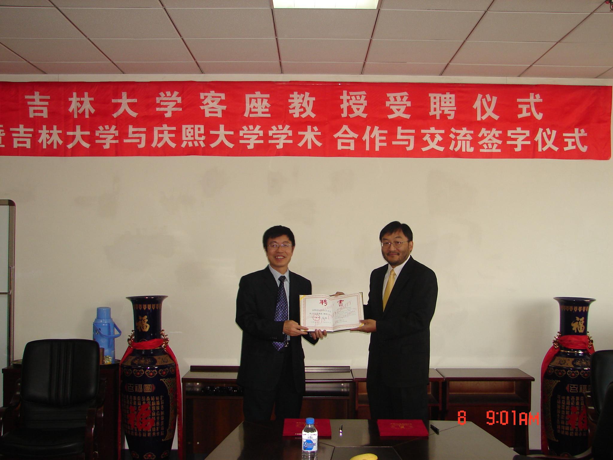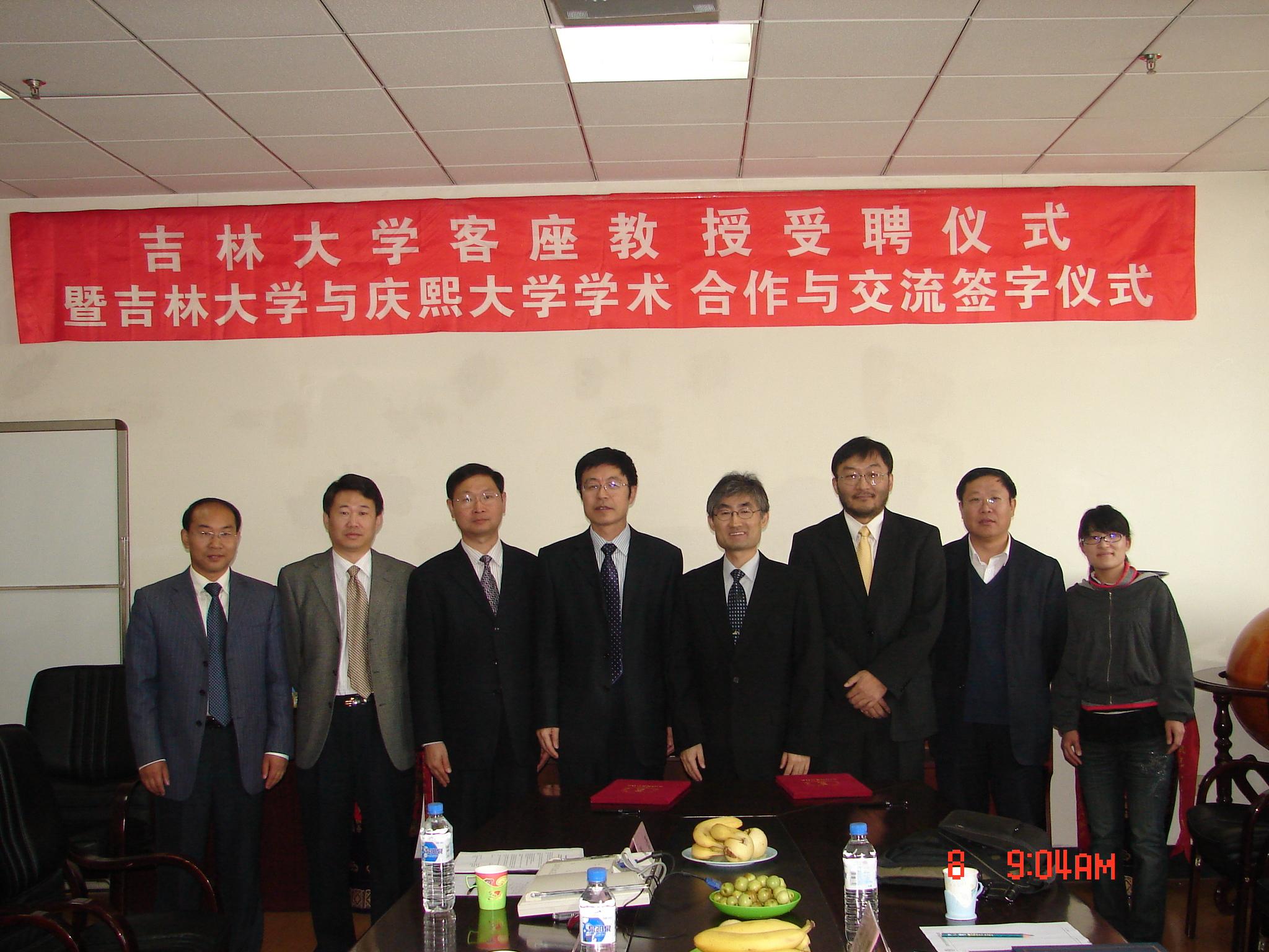 2010年10月8日上午9:00,吉林大学客座教授受聘仪式暨吉林大学与韩国庆熙大学学术合作交流签字仪式在吉林大学南岭校区逸夫机械材料馆517室隆重召开。机械学院院长杨兆军教授,党委书记王国强教授,副院长孟广伟、张雷教授,机械原理教研室冯增铭副教授及学院相关教师参加了此次仪式。仪式由机械学院副院长张雷教授主持。