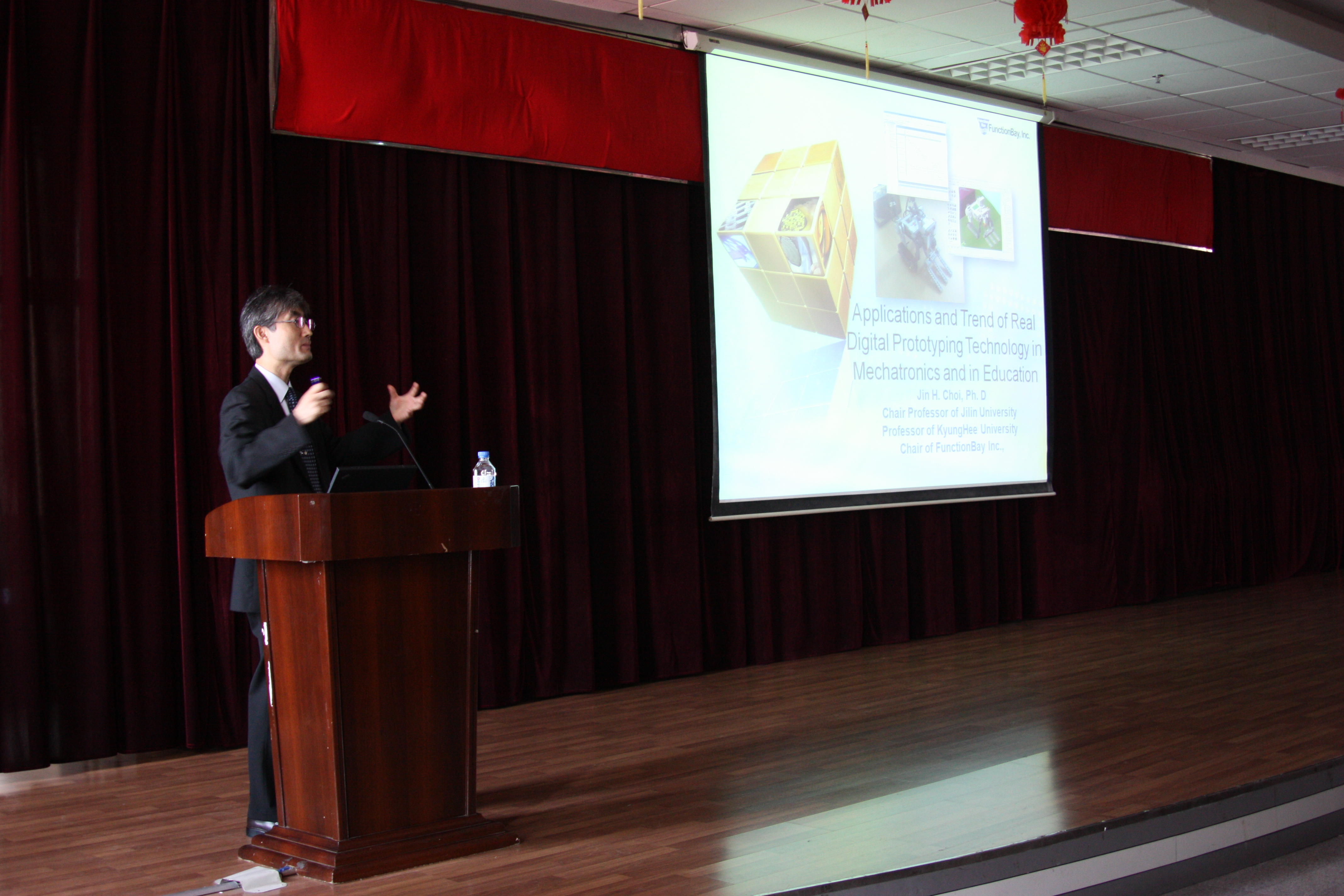 2010年10月8日上午10点40分,吉林大学南岭校区逸夫机械材料馆八楼学术报告厅,来自韩国庆熙大学的崔轸焕教授为机械学院的师生带来了一场题为“实境数字化样机(RDP)技术在机电一体化及其教学中的应用与趋势”的精彩的学术报告会。