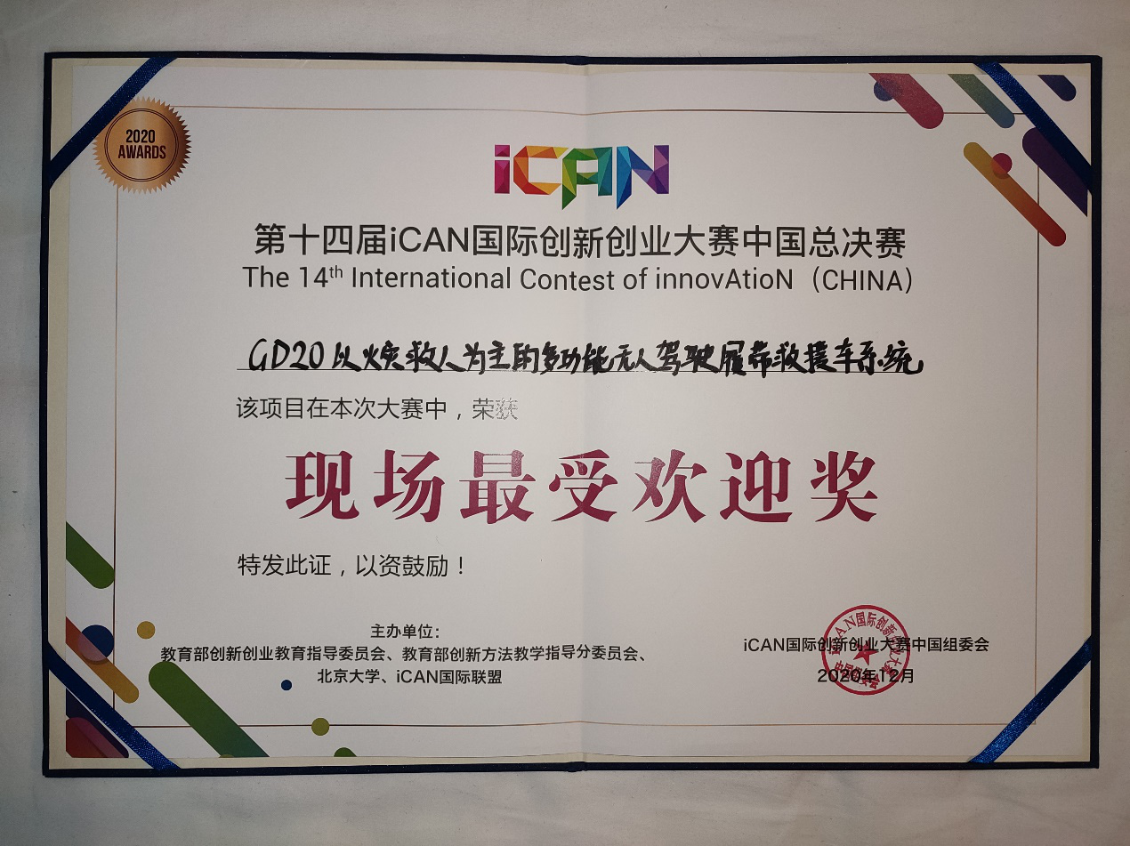 2020年12月26日,第十四届iCAN国际创新创业大赛中国总决赛在浙江余姚市举行,我院赖振龙等同学研制的“以火灾救人为主的多用途无人驾驶履带救援车系统”作品在820支决赛队伍中脱颖而出,斩获国家级一等奖,同时获得现场最受欢迎奖(仅五项)。