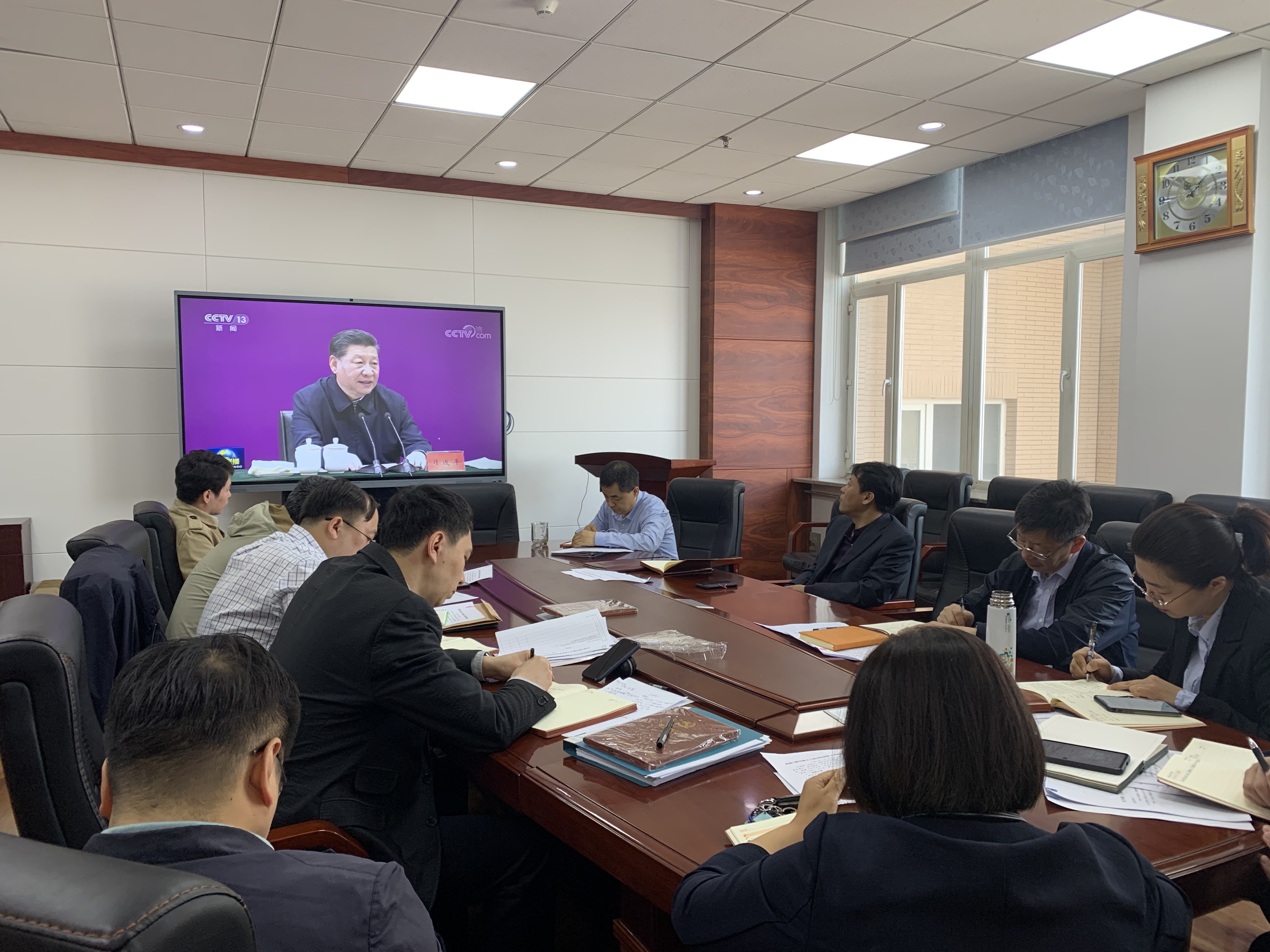 与会同志结合新闻联播视频材料《习近平在党史学习教育动员大会上强调 学党史悟思想办实事开新局 以优异成绩迎接建党一百周年》《习近平在清华大学考察时强调 坚持中国特色世界一流大学建设目标方向 为服务国家富强民族复兴人民幸福贡献力量》进行集中学习。