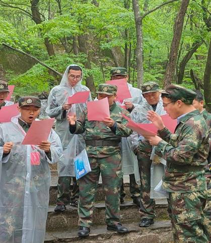 5月15日,全体学员在杨靖宇干部学院宣誓广场参加了“重走抗联路”出征仪式。面对鲜红的党旗,寇尊权教授带领全体学员庄严宣誓,重温入党誓词。通化市委党校杨博副校长为队伍授旗,寇教授宣布出征口令。此次红色之旅的第一个学习地点为集安市鸭绿江国境铁路大桥,在伪满时期日伪军奴役中朝劳工修建的炮楼和口岸大桥旁,通化市委党校佟勃萱老师现场教学,深情讲述了600多名集安将士奋勇杀敌的光辉事迹。第二个学习地点为集安市五女峰,佟老师带领学员徒步抗联小路,学员们沿着崎岖的“抗联路”,踏着抗联战士的足迹,体会革命先烈征战露宿的艰辛。在行进途中,班主任老师带领学员们进行了学唱东北抗日联军“露营之歌”和抗联诗歌朗诵比赛活动。学员们通过歌词感受抗联将士的艰苦岁月,感悟抗联将士的心灵支柱。全体学员精神饱满,斗志昂扬,引吭高歌。