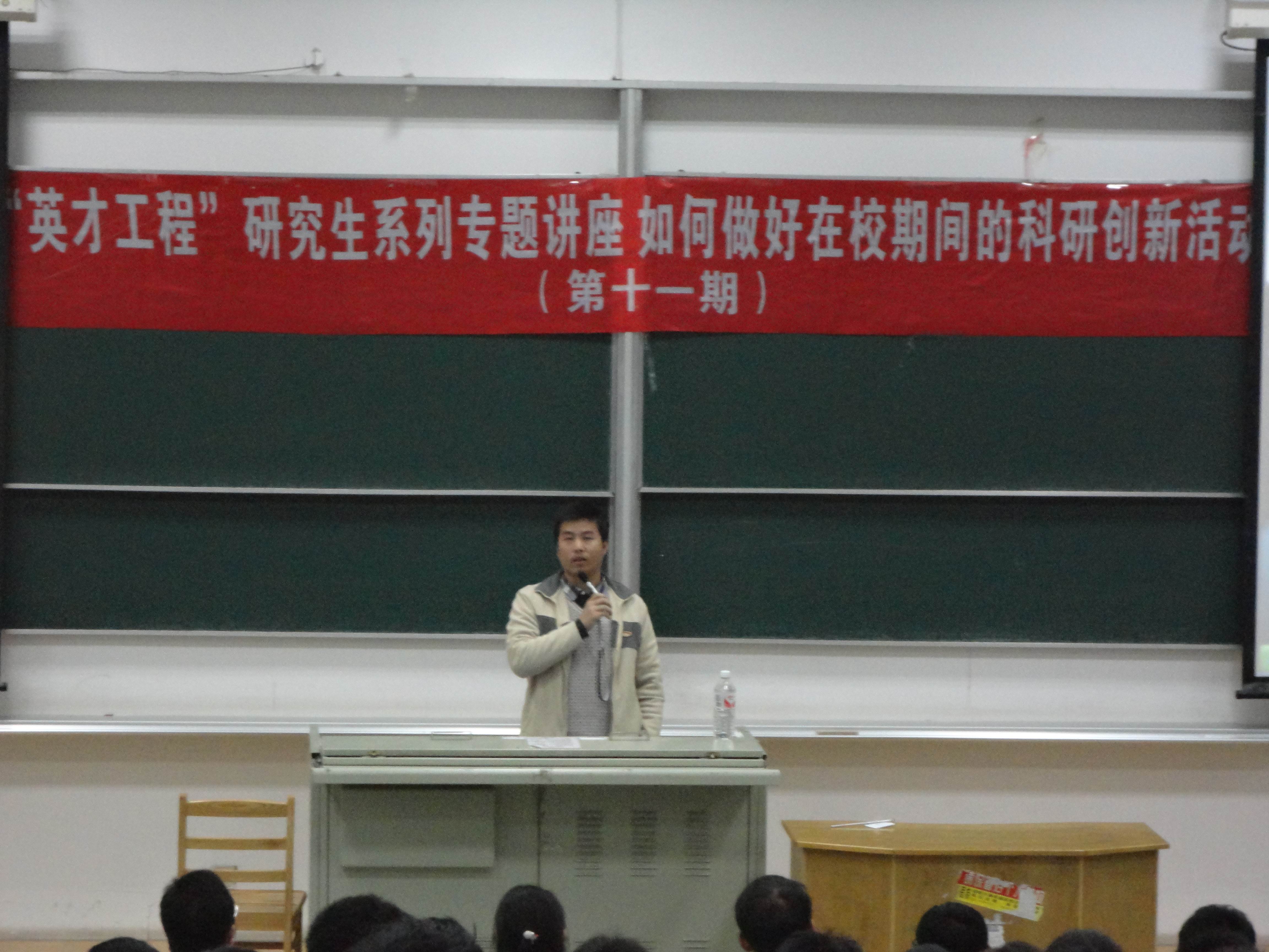 2011年11月5日15:30分,机械学院研究生团委、研究生会与吉林大学研究生创新中心联合举办的“英才工程”专题讲座(第十一期)在吉林大学南岭校区逸夫楼A511教室举行。