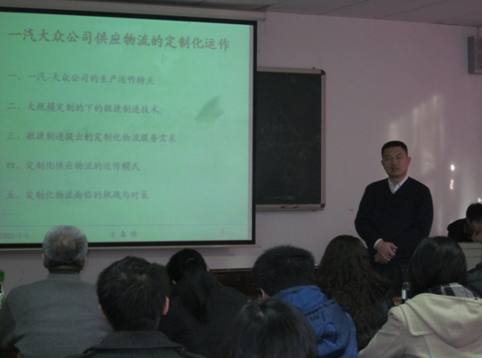 2011年11月20日上午8:30分,长春一汽大众集团有限公司管理培训主管方春明博士受工业工程系主任孔繁森教授的邀请,在南岭校区机械材料馆529室为机械学院师生做了一场题为《一汽大众公司供应物流的定制化运作》的专题讲座。