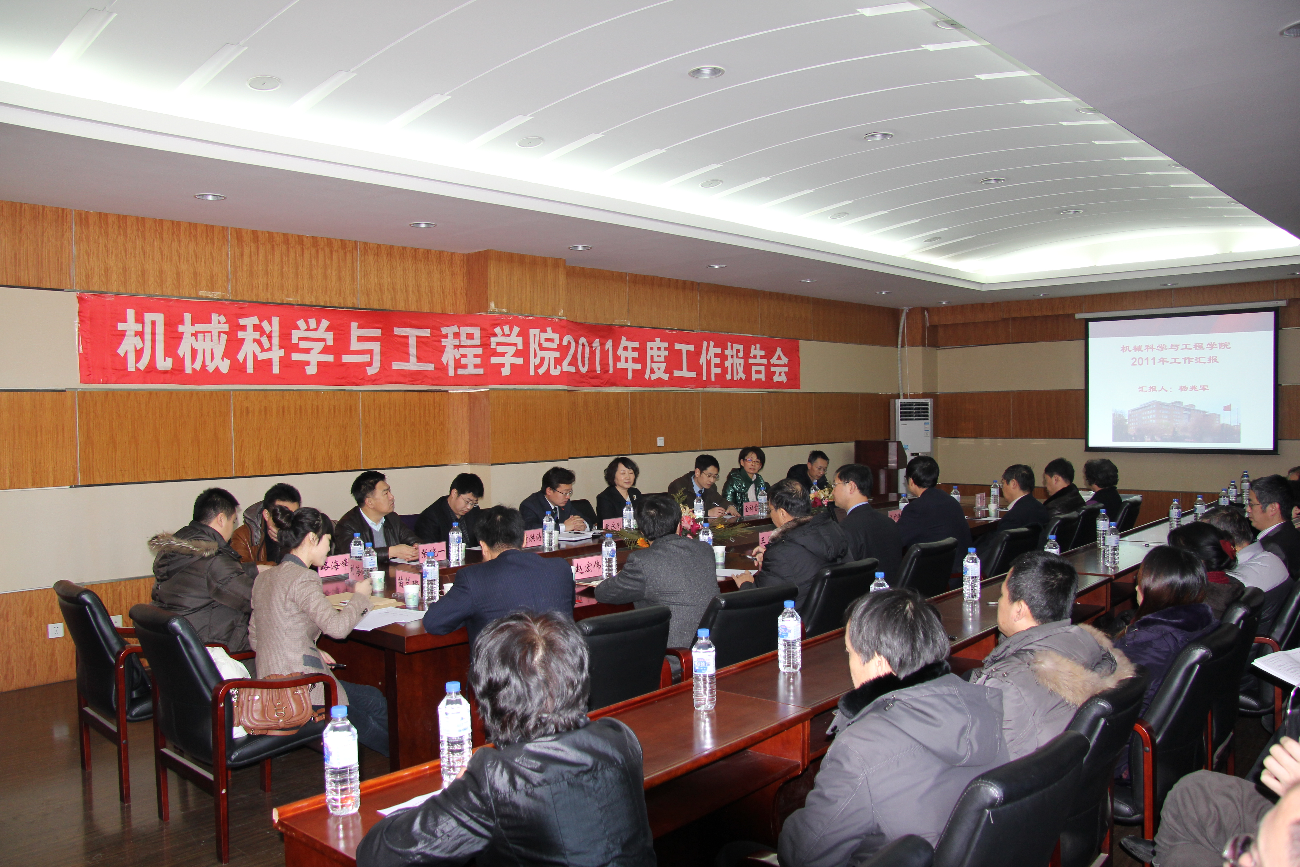 机械学院院长杨兆军教授首先做了关于机械学院行政与学术方面的工作总结报告,他分别从学院简介、学院“十二五”规划的编制情况、2011年学院工作总结、学院发展过程中存在的问题、解决的办法、希望及建议、2012年学院工作的思路和工作要点等几个方面向学校工作组及在座的各位老师进行了详细地汇报。然后,机械学院党委书记王国强教授就机械学院党建与思想政治工作情况向大家进行了汇报。