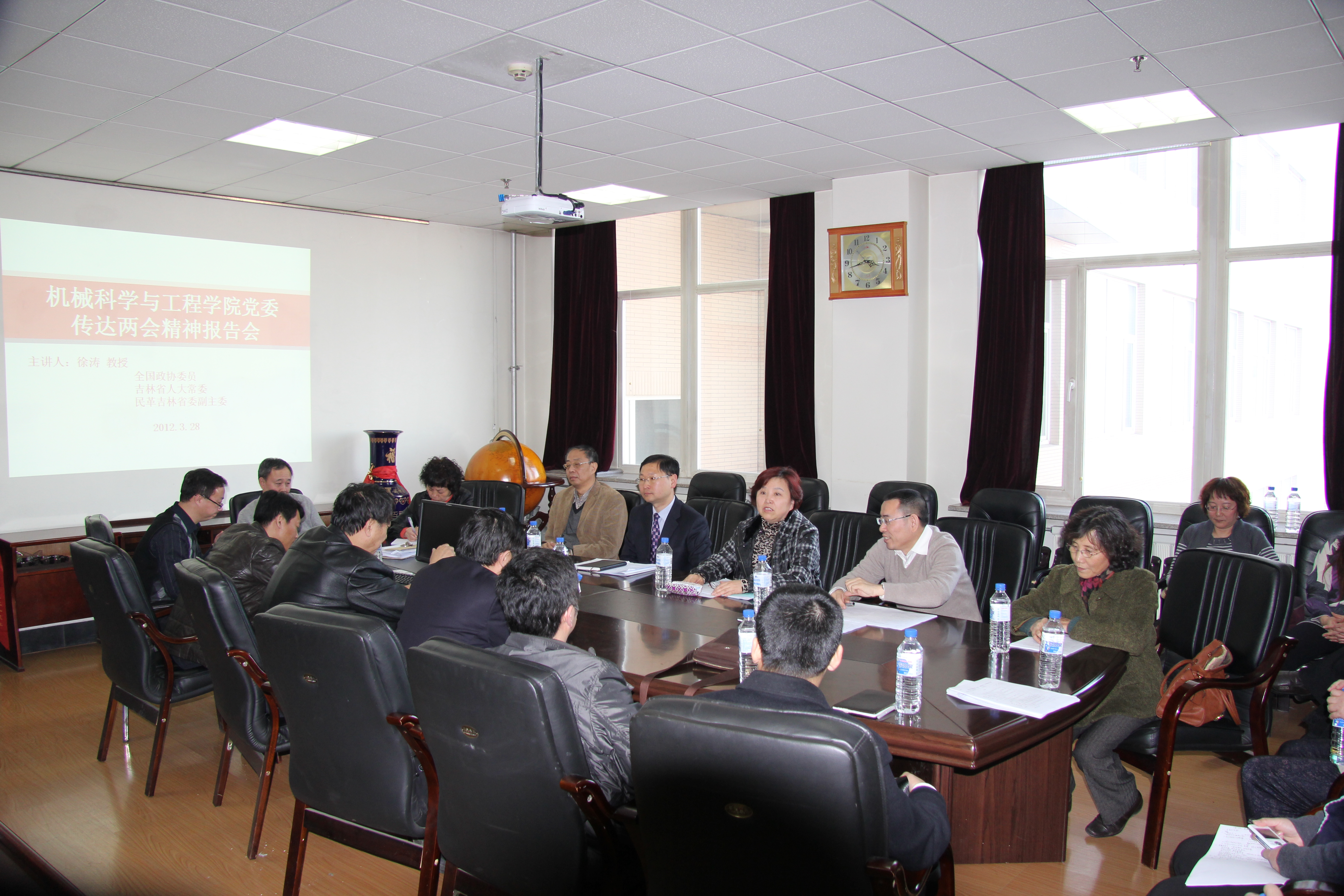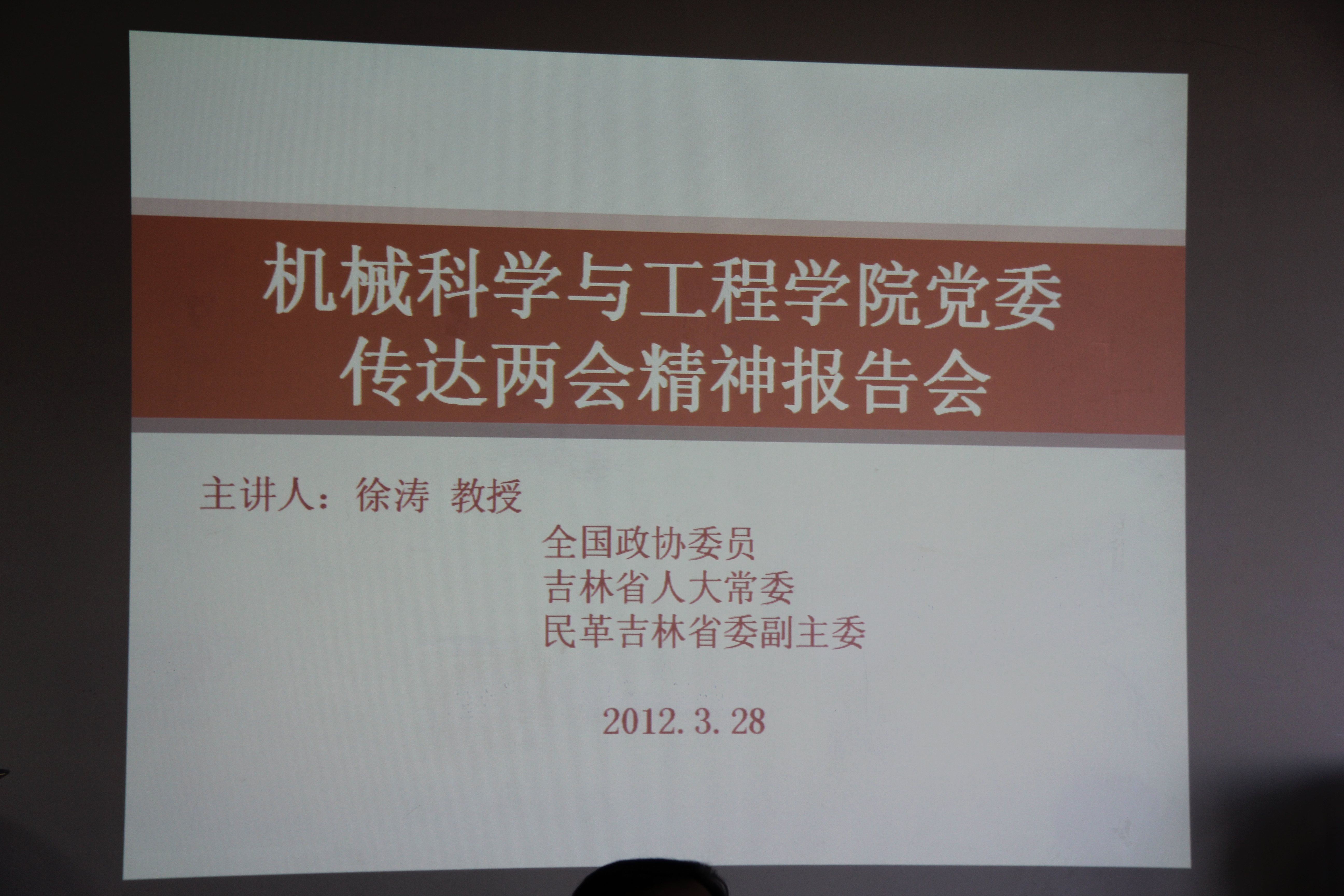 为认真学习贯彻十一届全国人大五次会议和全国政协十一届五次会议精神,进一步统一思想,提高认识,促进和谐,推进学院工作快速发展,3月28日下午,机械学院党委在机械馆517会议室召开了“机械科学与工程学院传达两会精神报告会”, 邀请全国政协委员、吉林省人大常委,民革吉林省副主委、博士生导师徐涛教授为大家作报告。学院班子成员,党委委员,党支部书记,民主党派负责人,各系主任,各系妇委会主任等人员参加会议,会议由学院党委书记王国强教授主持。