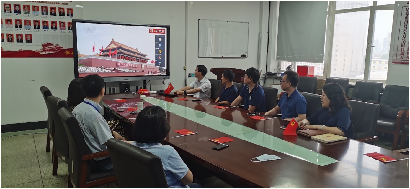 7月1日上午8时整,庆祝中国共产党成立100周年大会在北京天安门广场隆重举行,机械制造及自动化系教工党支部通过线下线上相结合的形式,组织党员观看建党百年庆典盛况,聆听习近平总书记重要讲话,共同感受振奋人心的时刻。