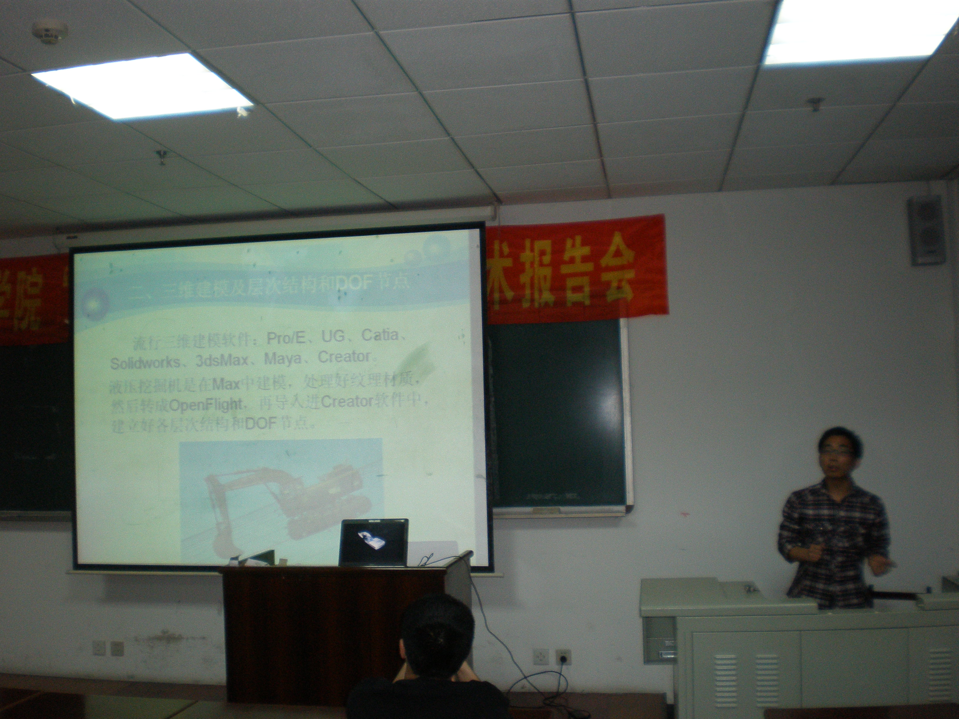 此次报告会由于长志同学主讲,他对挖掘机的三维模拟仿真技术进行了全面地剖析,进而让同学们对虚拟技术有了更为直观的认识。他从六个方面进行了讲解:1)虚拟现实软件介绍;2)三维建模及层次结构和DOF节点;3)挖掘机进行的动态交互;4)拼接技术;5)驾驶模拟器;6)正在兴起的增强现实。随后,通过视频演示非常直观地给大家展示了虚拟现实的可操纵性。最后,于长志对虚拟技术做了展望并与同学们进行了互动,探讨了一些关于虚拟现实技术中遇到的相关问题及解决方法,并希望有兴趣致力于虚拟技术研究的同学能够在这方面有所作为。