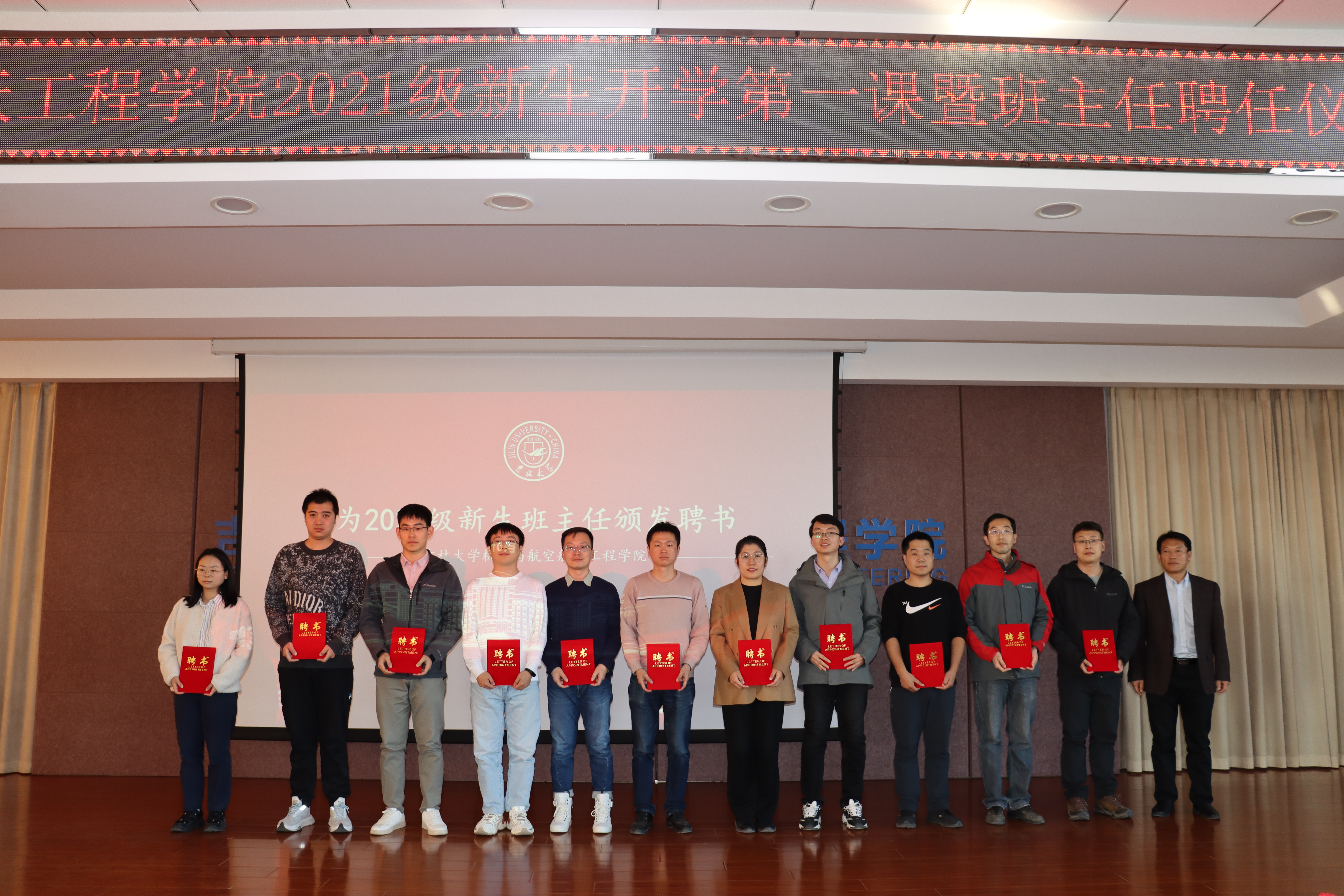 党委副书记兼副院长马艳秋宣读了《新葡的京集团8814关于任聘2021级新生班主任的决定》,党委书记郑福胜为受聘班主任颁发聘书并合影留念。