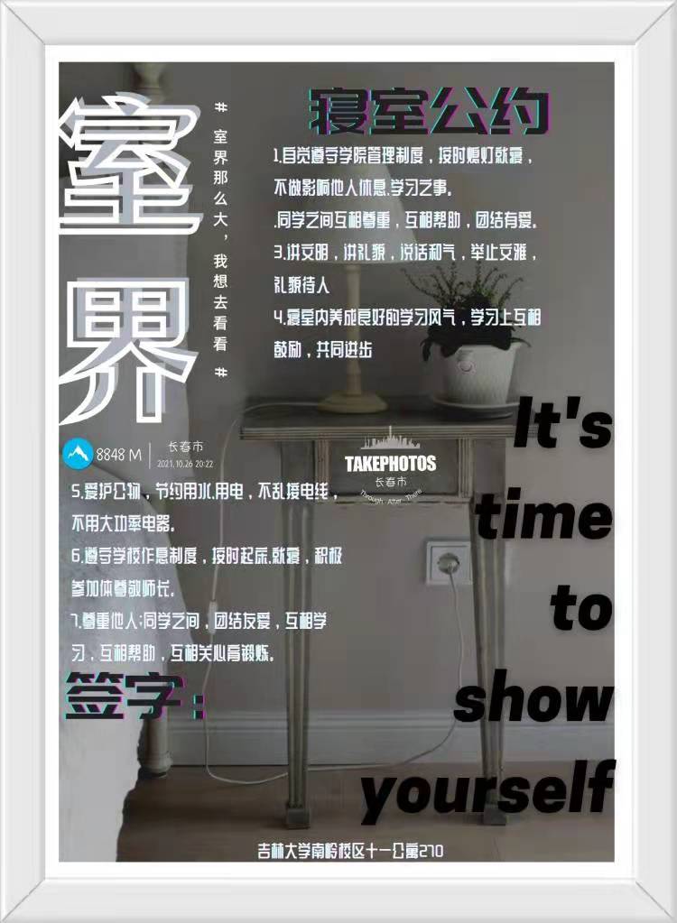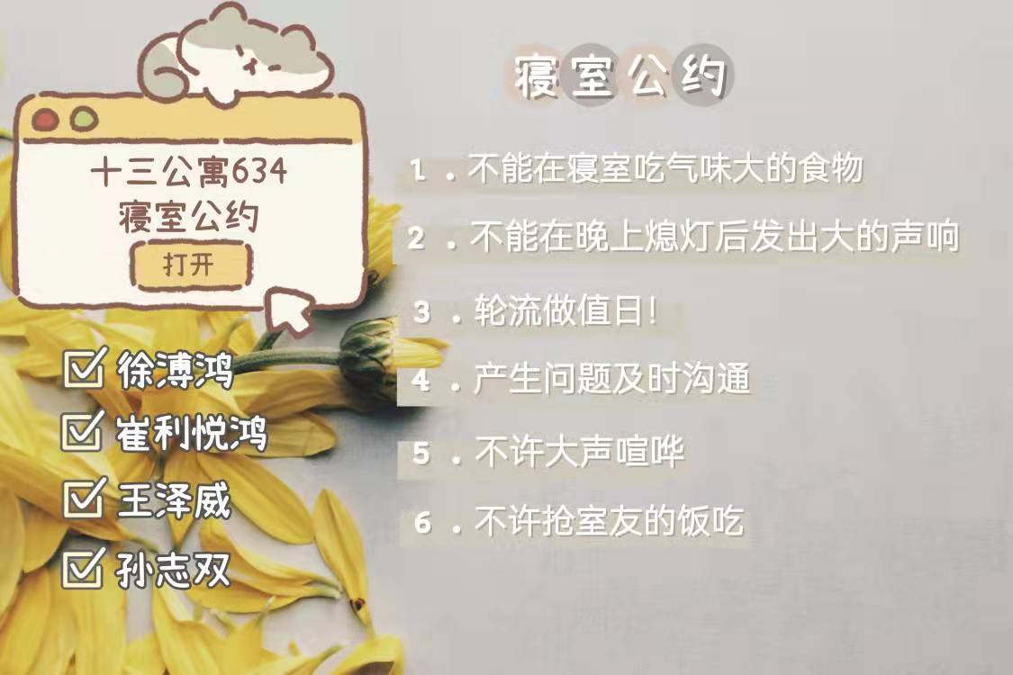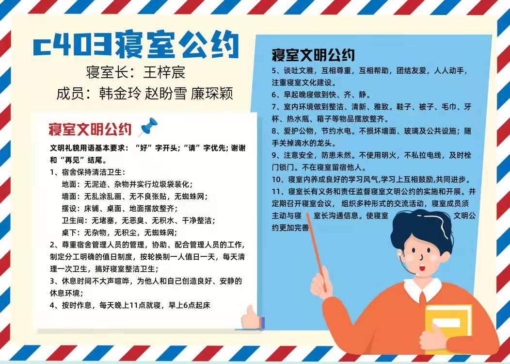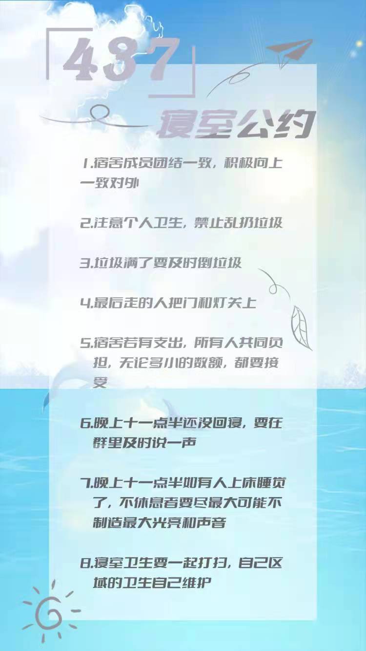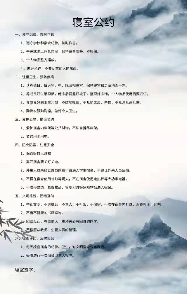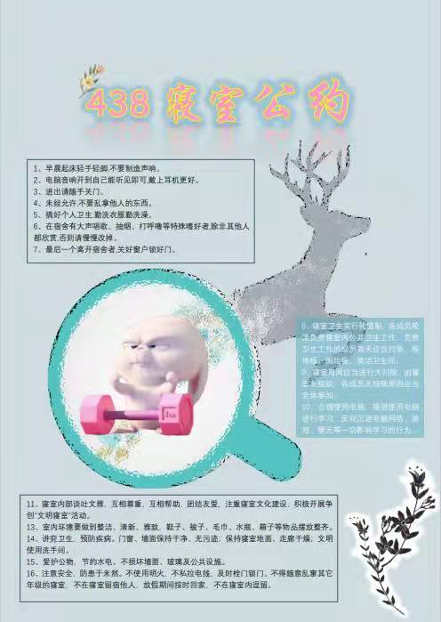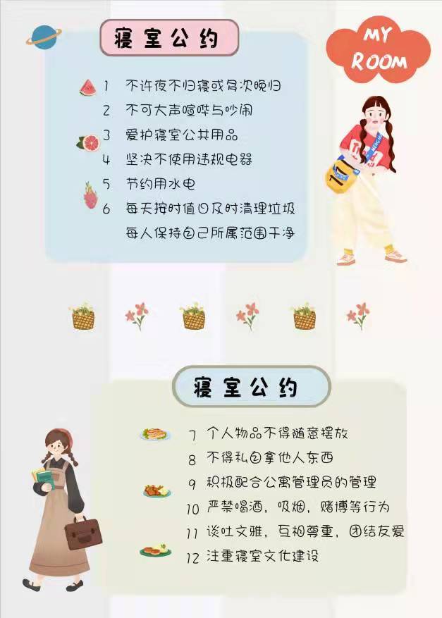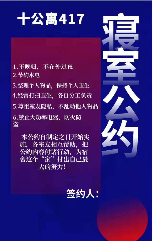 为进一步加强公寓文化建设,发挥公寓育人阵地作用,推动学生寝室制度化、有序化管理,引导学生养成良好的生活习惯,营造文明和谐、干净整洁的寝室文化氛围,我院于10月20-25日开展了全员参与创建寝室文明公约活动。寝室公约是寝室共同居住成员在遵守学校规章制度的前提下,就作息时间、值日制度、寝室安全等方面,经友好协商、普遍认可、自主约定形成的公共准则。组织学生签订寝室公约对促进寝室和谐、减少寝室矛盾、增进同学情谊、增强寝室凝聚力具有重要意义。接下来,学院将统一印制文明公约海报,统一张贴在寝室内,全员签约。希望同学们信守公约,共同创造一个“安全、文明、卫生、和谐”的生活环境!