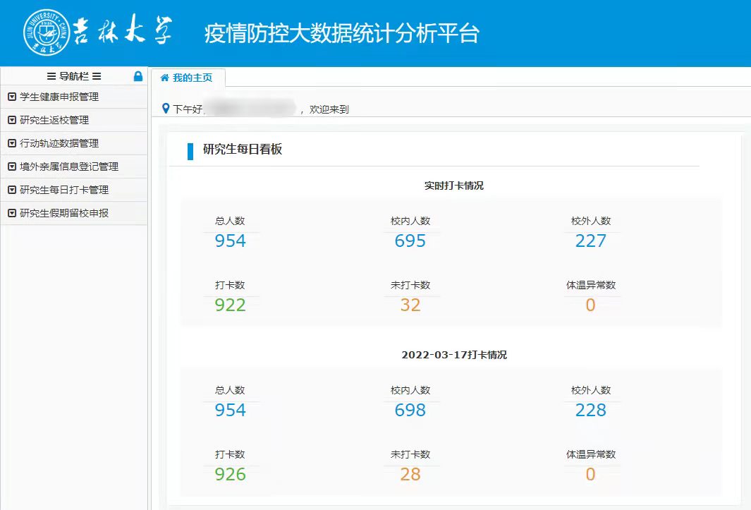 确保科学防控“数据源”。依托吉林大学疫情防控大数据统计分析平台,学院以班级和学生党支部为单位,进行每日的健康打卡监测和督促,严格把握研究生的健康情况,做到精准到人,无一遗漏。同时确保全面畅通的沟通渠道,通过班级群、年级群、志愿工作群、班长群、层长群,及时传达、统计学生信息,保障防控措施落实到位、师生意见反馈到位,在师生间形成了“有事报情况,无事报平安”的良好沟通氛围。