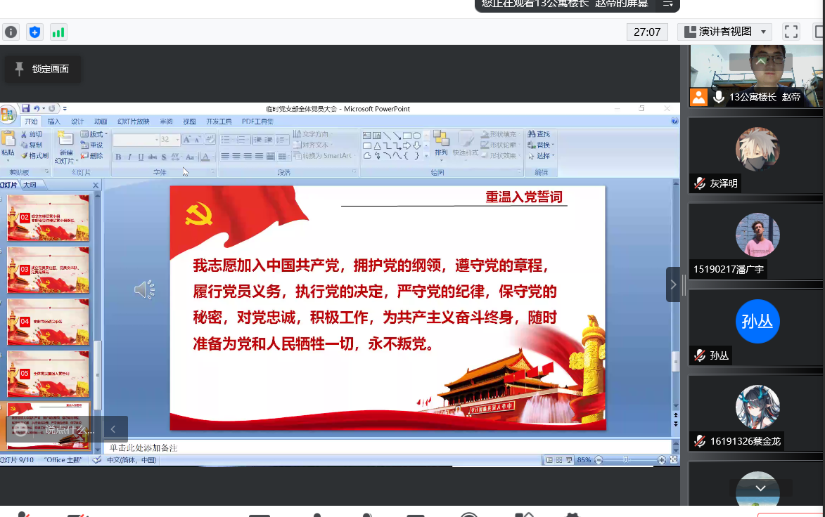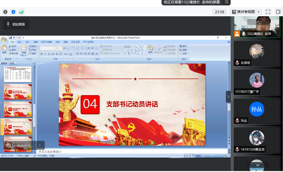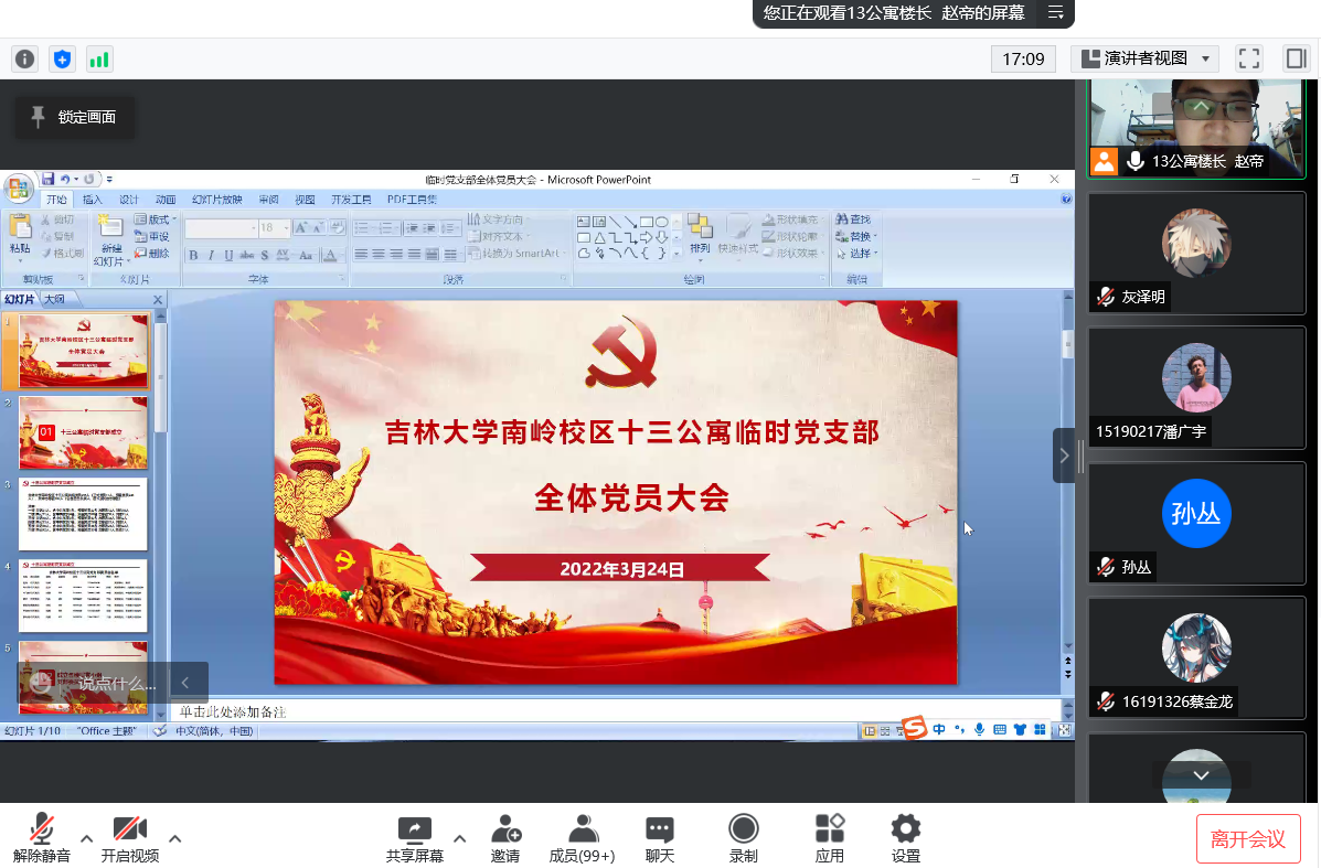 为深入贯彻习近平总书记关于疫情防控工作重要指示批示精神,积极应对当前复杂严峻的疫情防控形势,充分发挥基层党组织战斗堡垒作用和共产党员先锋模范作用,进一步加强学生教育服务保障工作,3月24日晚,吉林大学南岭校区十三公寓临时党支部全体党员大会于线上顺利召开。大会由党支部书记赵帝主持,南岭校区十三公寓临时党支部全体党员参加了本次大会。