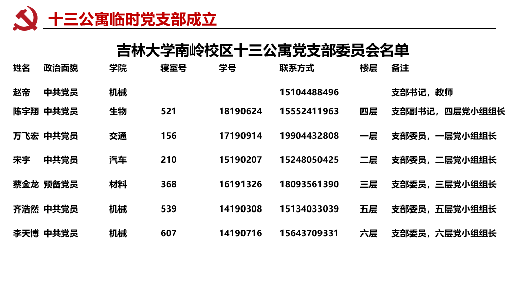 首先,党支部书记赵帝宣读了十三公寓临时党支部成立的决定。随后宣读了支部委员会名单,委员会组成有支部书记一名,支部副书记一名,支部委员五名,共计七人。会议决定任命支部副书记及支部委员为各层党小组组长。