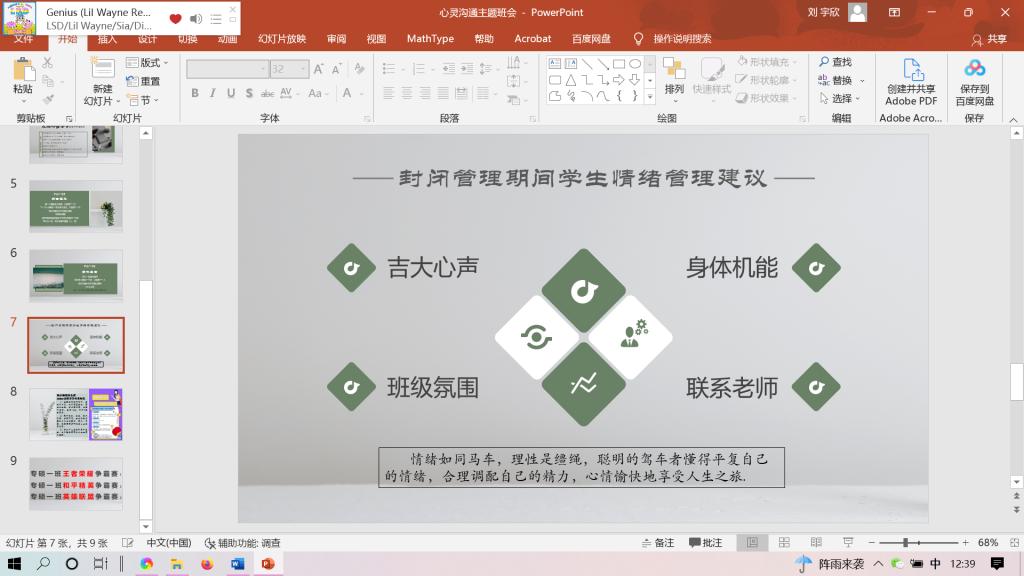 基于封闭管理要求,本次“心理班会”以班级为单位采用线上方式举办。为克服线上班会在策划与实施上的诸多不便,切实提高同学们的心理调节能力,在对各班心理委员进行培训的基础上,围绕心理健康指导中心提供的活动方案,群策群力、集思广益,增加活动的趣味性,以保证活动达到理想的效果。在热身环节后各班同学分别在90分钟的时间里,通过摇摆时钟、情绪安慰剂、不烦躁的理由、我的一天、见证彼此、我的收获等环节察觉和捕捉自己的情绪状态,真诚地表达和分享自身感受。专硕一班还通过故事分享、接龙造句等游戏环节帮助同学们保持愉悦心情,减轻焦虑情绪。力学专业班级在活动的最后选择以歌曲合唱的形式来收尾,让同学们在特殊时期感受到了团体的温暖。