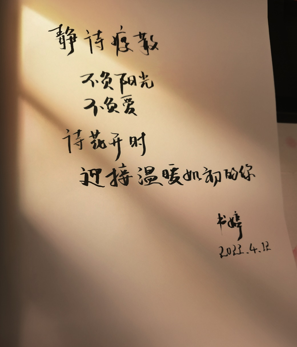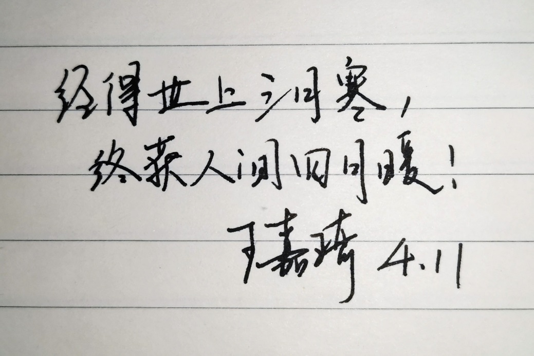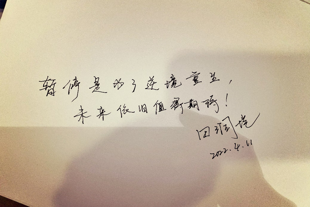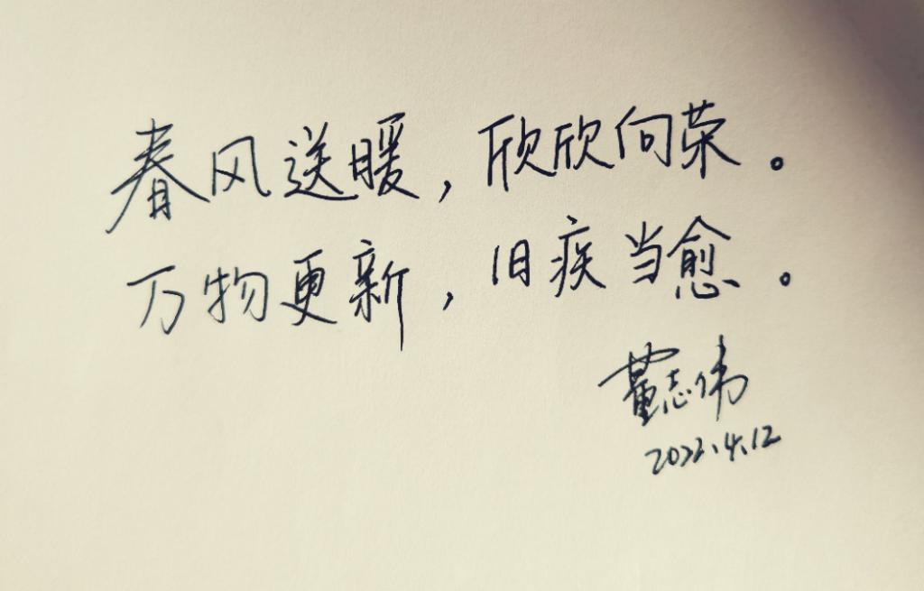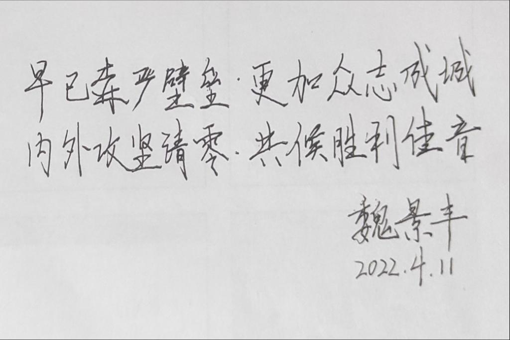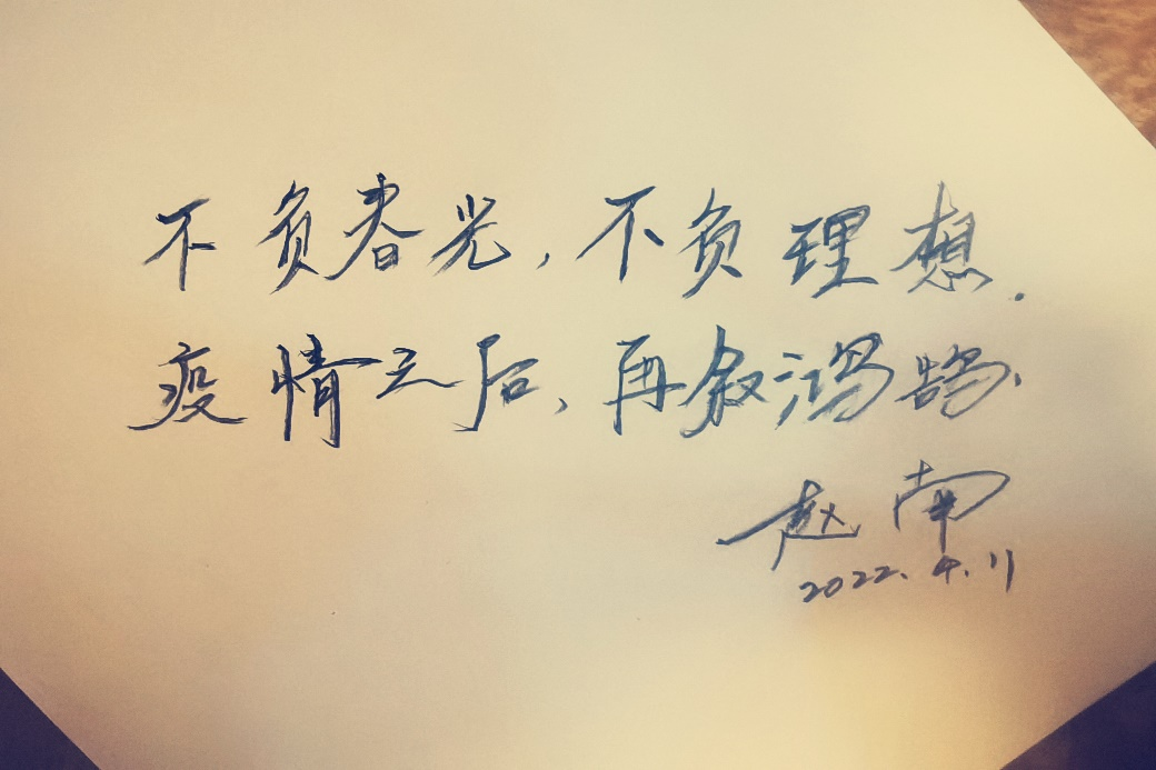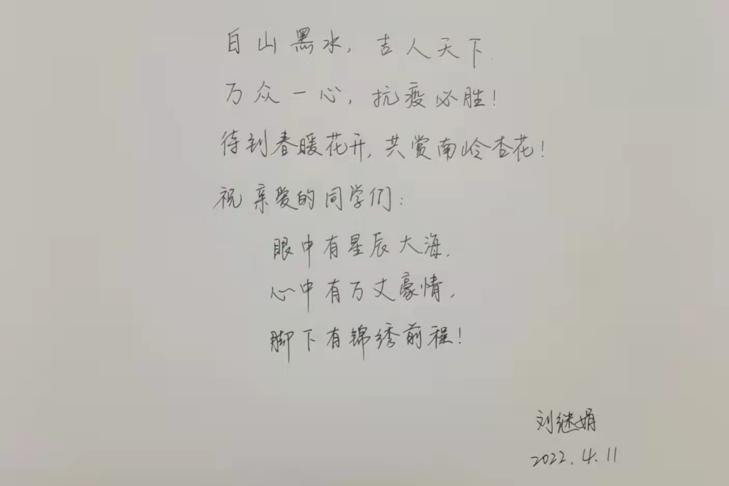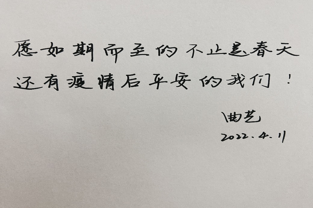 为深入贯彻落实我校对疫情防控工作要求,新葡的京集团8814组织“落笔祈愿、抗疫心语”线上寄语活动,以“抗疫寄语”表情感、强信心、寄嘱托。从4月11日至4月13日,我院老师和同学们踊跃参加、快速响应,用一幅幅生动的笔墨书写最动情的话语。在这别样的春日里,一句暖心话、一句祝福语、一段激励词,是我院师生内心由衷的感受,也是我院师生无惧疫情、充满信心的体现,更是我院师生对战胜疫情后美好未来生活的期待!
