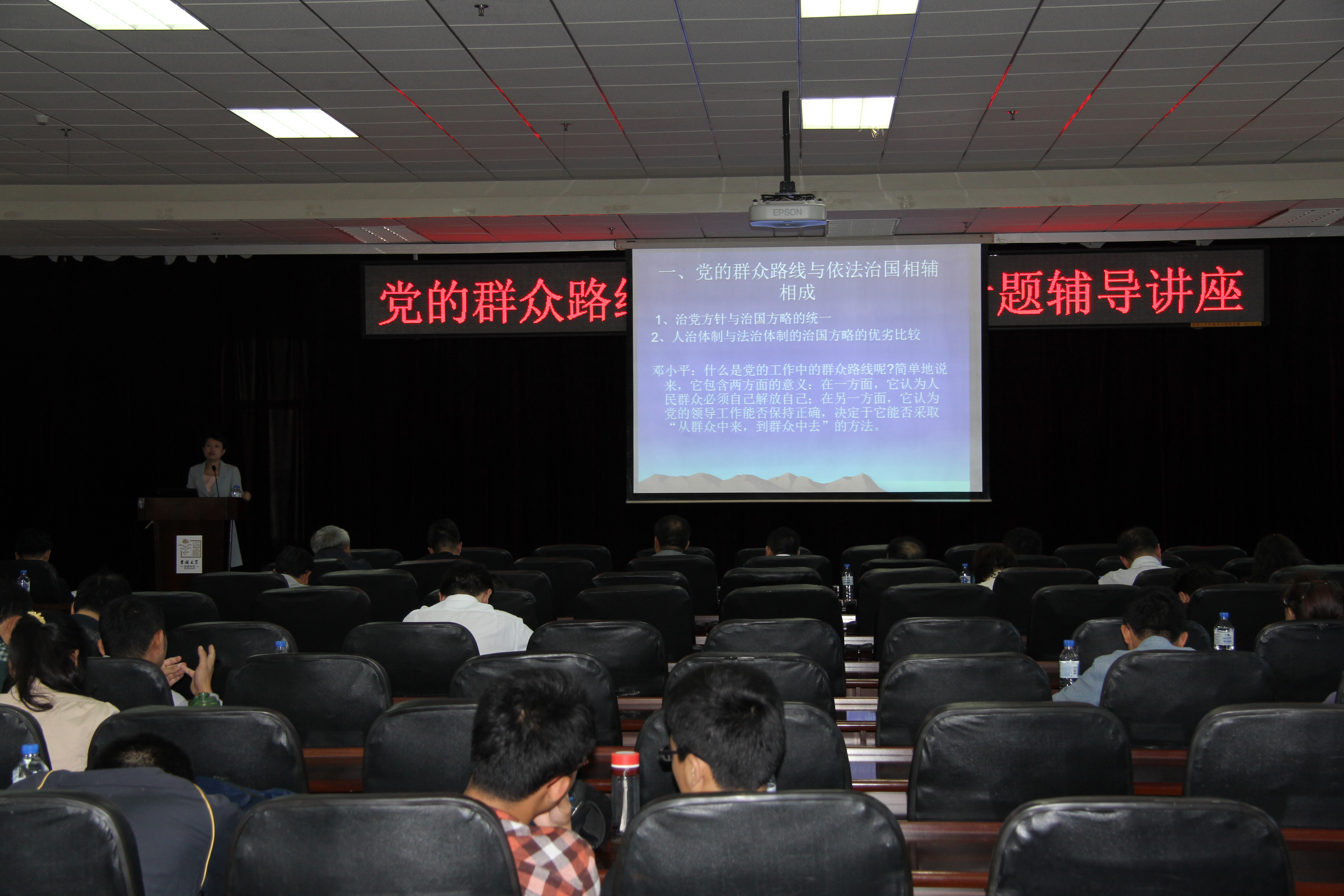 本次讲座围绕“依法治国与党的群众路线”展开,对两者之间的关系进行了论述,从人治与法制的角度出发,深刻阐述了群众路线的涵义,加深了大家对群众路线的理解,并系统全面地分析了依法治国与党的群众路线的高度统一性。许教授的报告内容翔实丰富、语言生动凝练,主题突出、分析透彻,并配有精彩生动的案例演示,获得了与会人员的一致好评。
