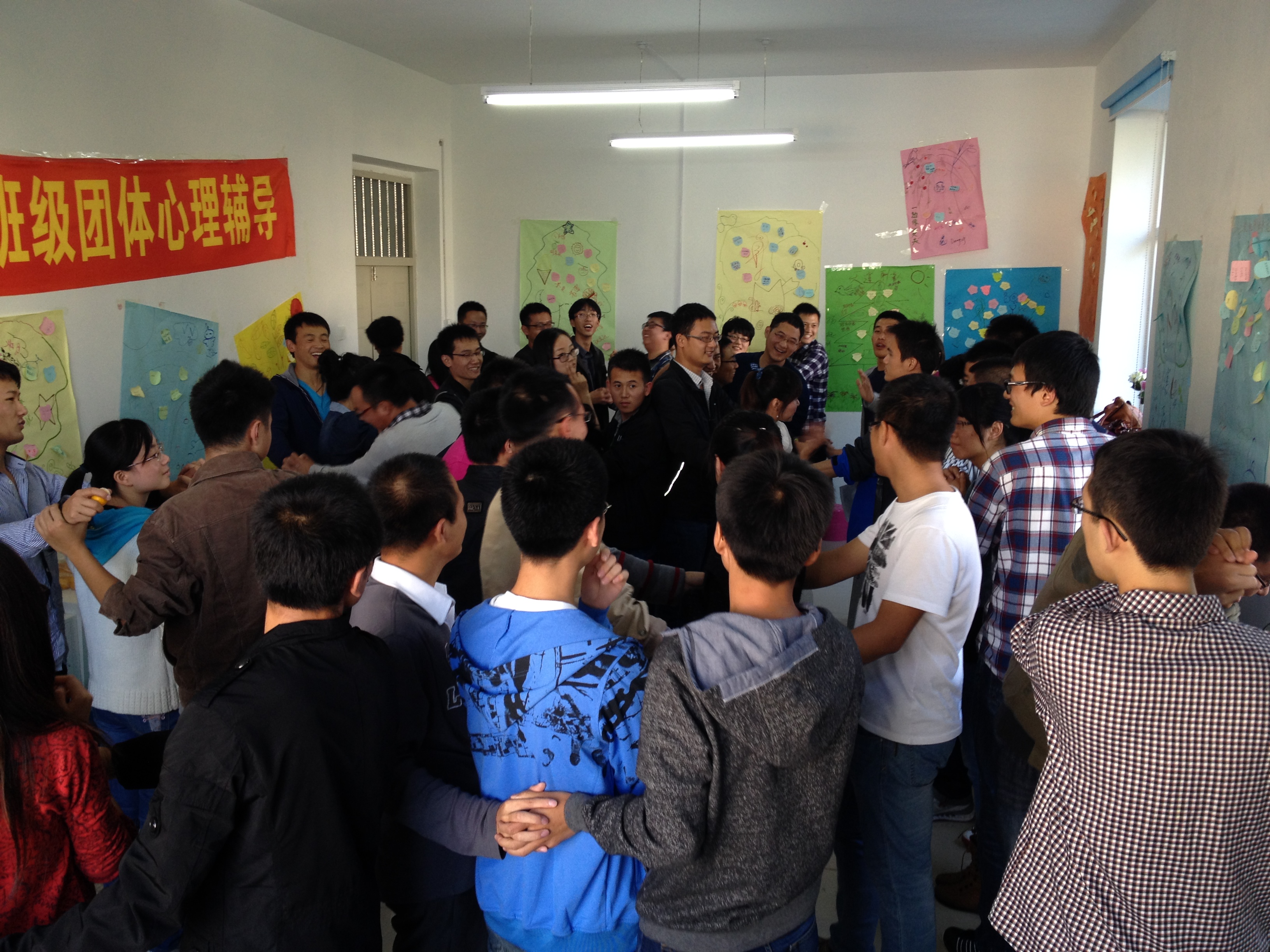 本次活动以“我们是相亲相爱的一家人”为主题,以班级为单位开展,分阶段对同学们进行团体心理辅导。活动现场氛围轻松快乐,通过丰富多彩的游戏帮助同学们更快的融入到班级集体中。“一分钟鼓掌”和“无家可归”两个小游戏迅速拉近了班级同学间的距离;随后,“巧记名字”、“信任之旅”更是让同学们在游戏的同时树立了团队意识,学会了信任;“集体登陆”更是将整场活动带向了高潮,现场气氛十分热烈。接下来的几个游戏中,同学们之间相互协助,相互鼓励,活动进行的十分顺利。最后,同学共同绘制了“团体树”并合影留念。