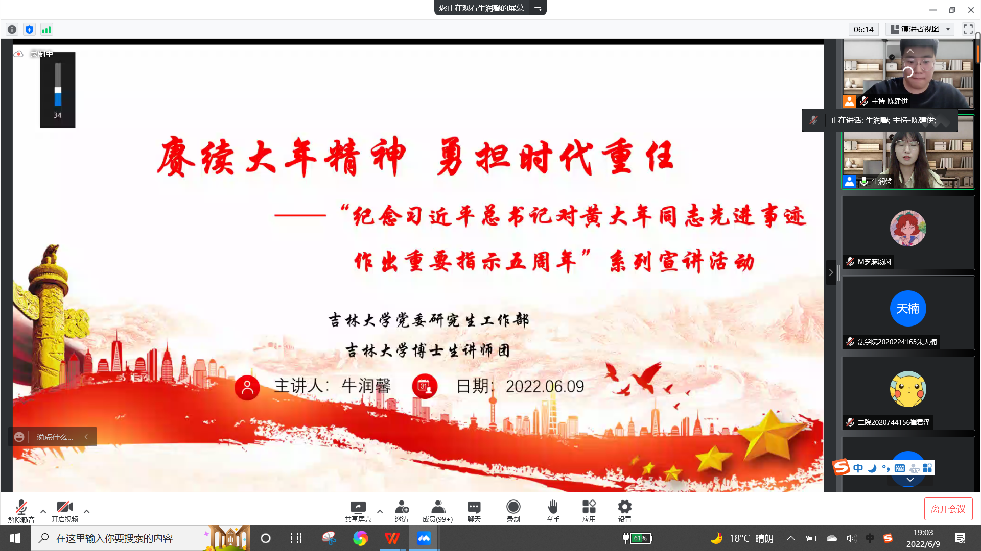 为牢记习近平总书记的殷切嘱托,深入开展黄大年精神学习活动,2022年5月25日—6月9日,吉林大学开展了“赓续大年精神,勇担时代重任—纪念习近平总书记对黄大年同志先进事迹作出重要指示五周年”系列宣讲活动。此次活动由吉林大学博士生讲师团主讲,通过线上形式每晚与广大师生交流分享,分为五个主题,以吉大人的视角,讲述黄大年老师的感人事迹,弘扬黄大年精神。新葡的京集团8814积极响应号召,组织动员全体在籍研究生在线观看。
