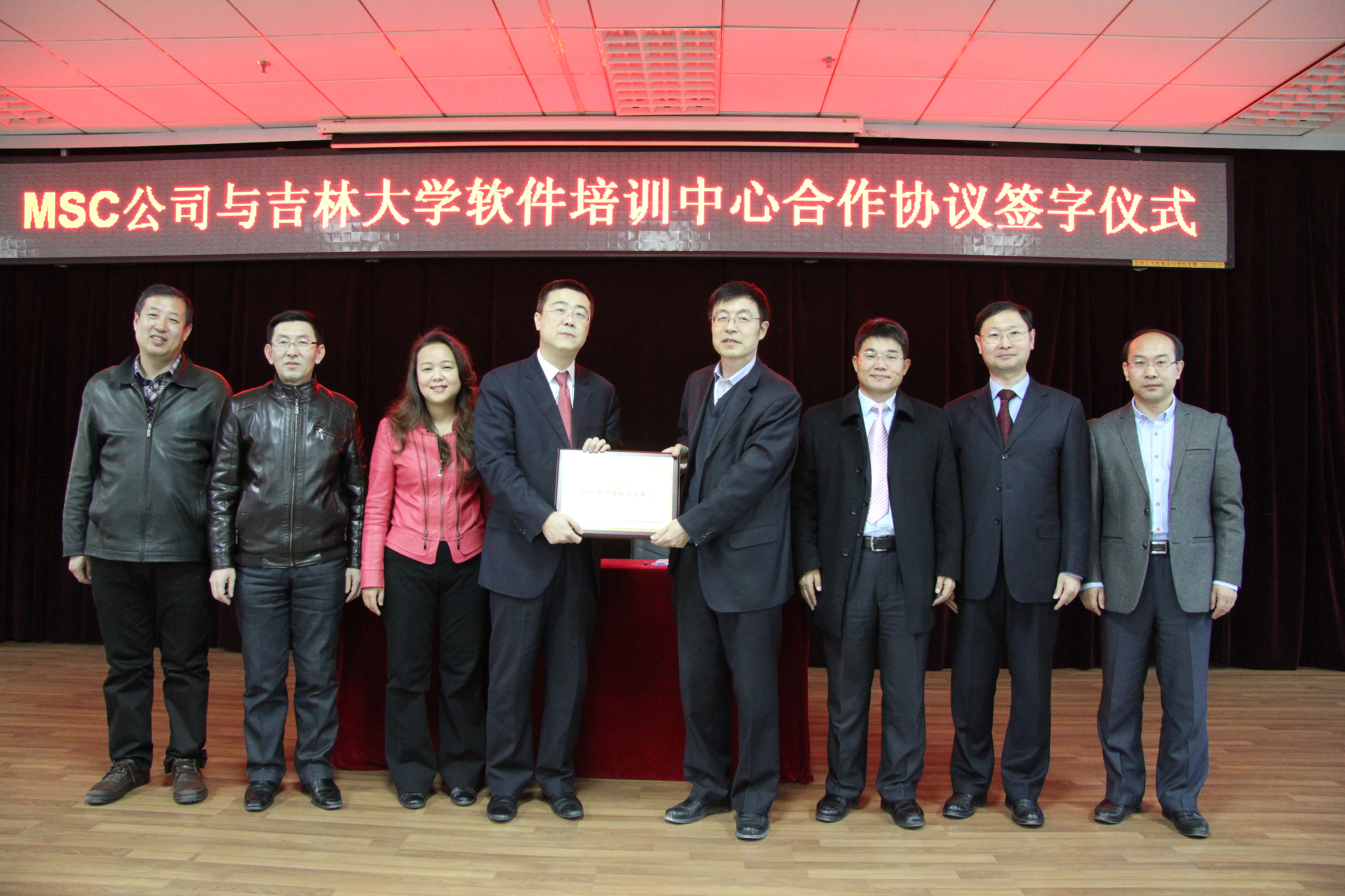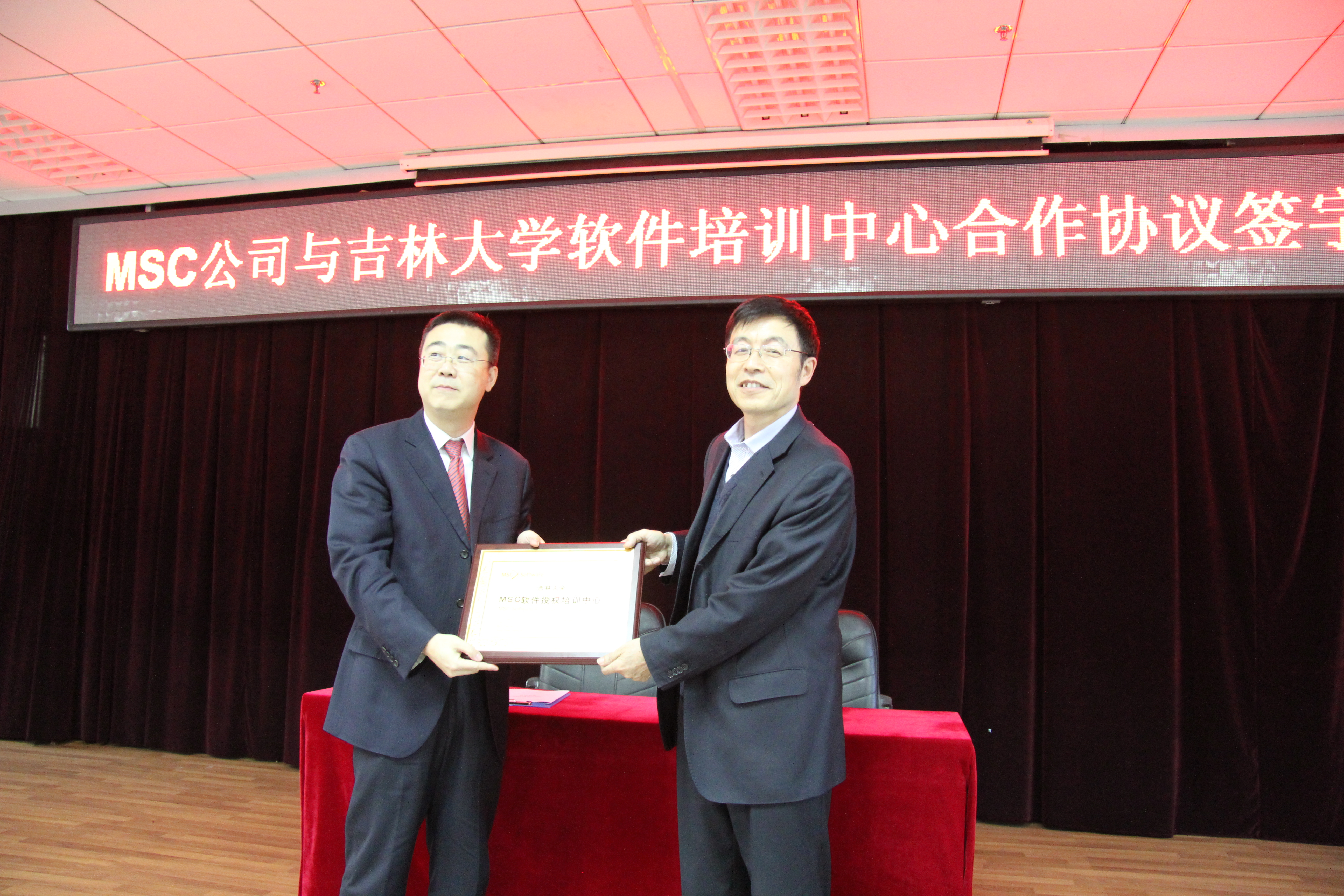 2014年3月18日下午2:00,MSC软件授权培训中心签字仪式在吉林大学南岭校区逸夫机械材料馆八楼学术报告厅举行。机械学院院长杨兆军教授,学院党委书记王国强教授,继续教育学院李宝永院长,东区教务办王利军主任,MSC公司大中华区总经理刘宏宇先生出席了本次签字仪式。杨兆军院长和刘宏宇总经理代表双方签署了MSC公司与吉林大学MSC软件授权培训中心合作协议。