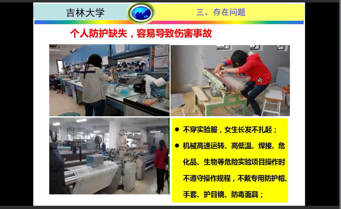 最后,环境安全督查专家徐泽为师生介绍了吉林大学实验室安全工作相关内容,针对高校实验室中常见的危险源及存在的安全隐患进行举例,着重介绍了实验室“三不伤害”原则:不伤害自己、不伤害别人、不被别人伤害以及面对危险时的应对方法,参会师生表示受益匪浅。
