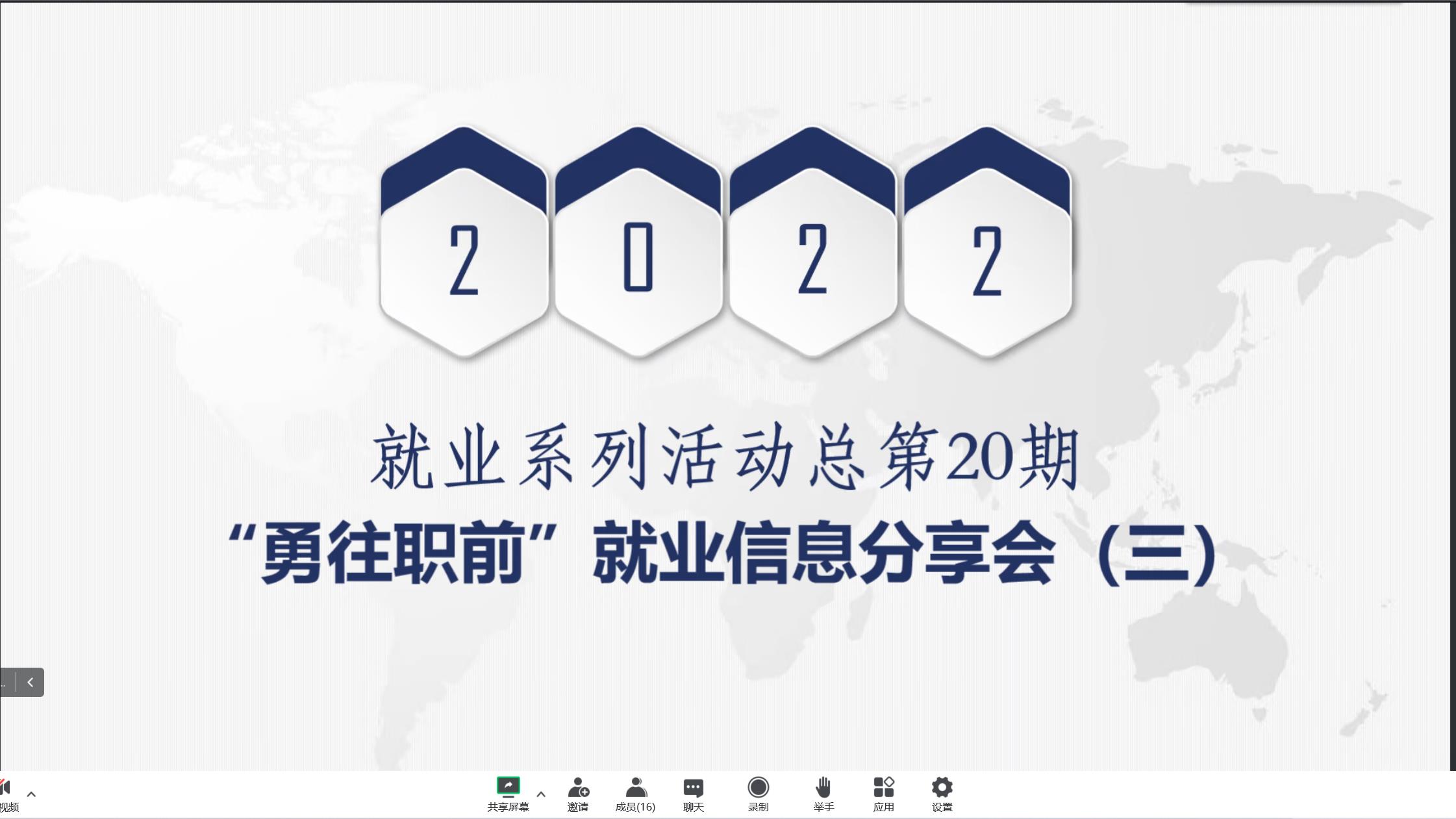 为进一步加强我院对研究生就业指导,推进我院毕业生顺利签约,10月21日上午,新葡的京集团8814通过腾讯会议线上开展“勇往‘职’前”就业信息分享会(三),2020级研究生参加了本期活动。