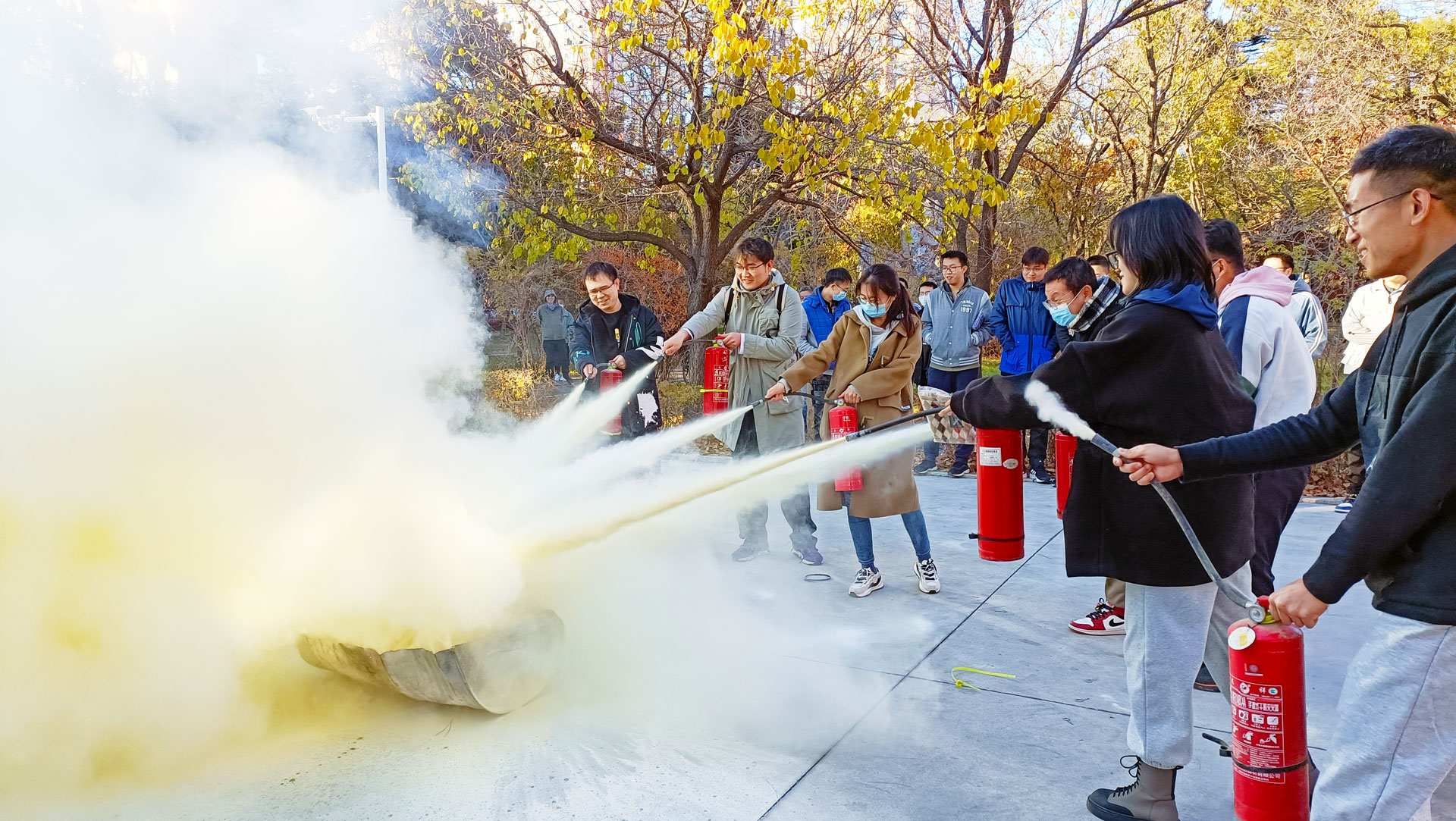 现场师生兴趣盎然、踊跃参与灭火实操。演练过程中,王中刚老师还针对同学们距离火源过近、未指向火焰根部等问题,进行了指导。