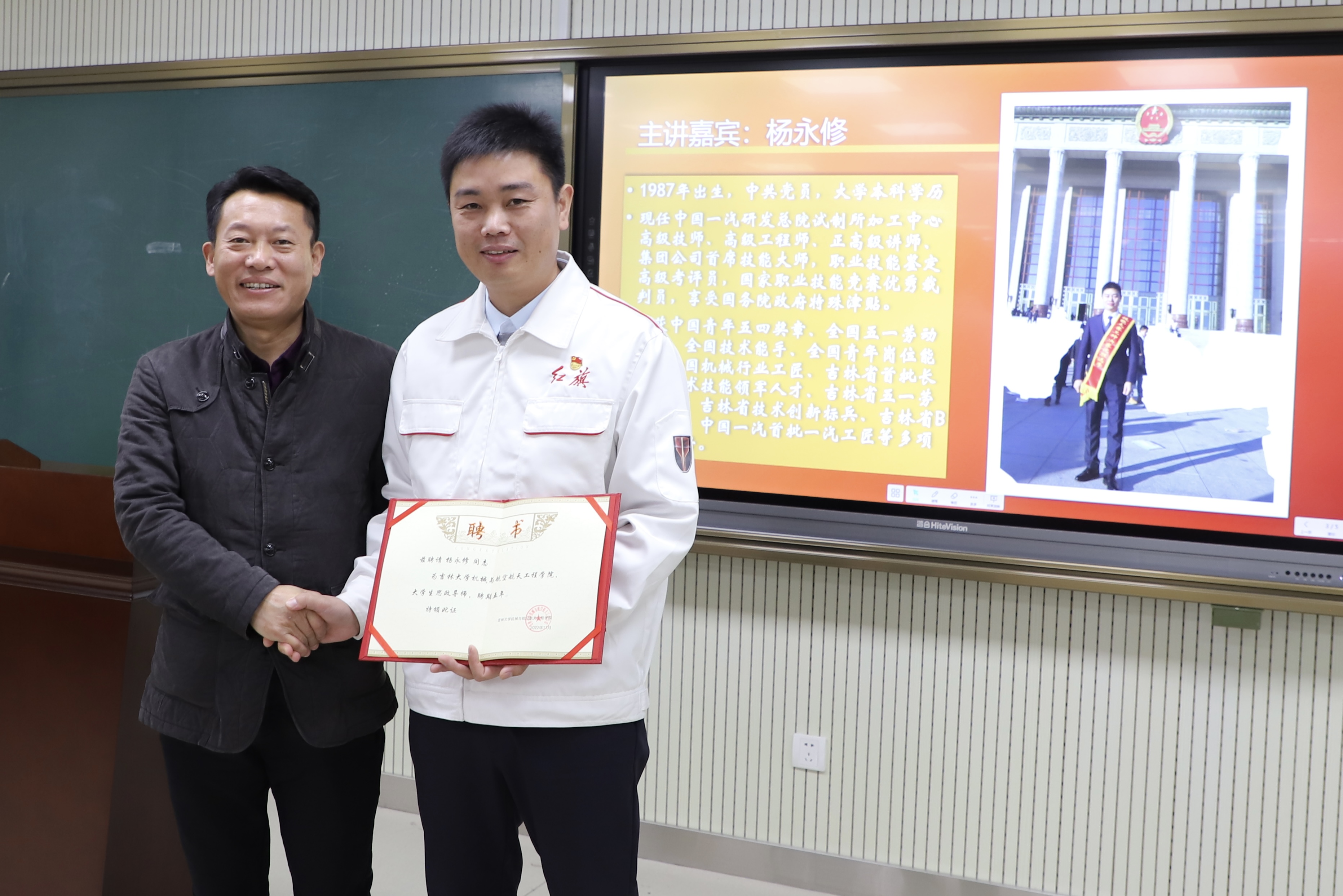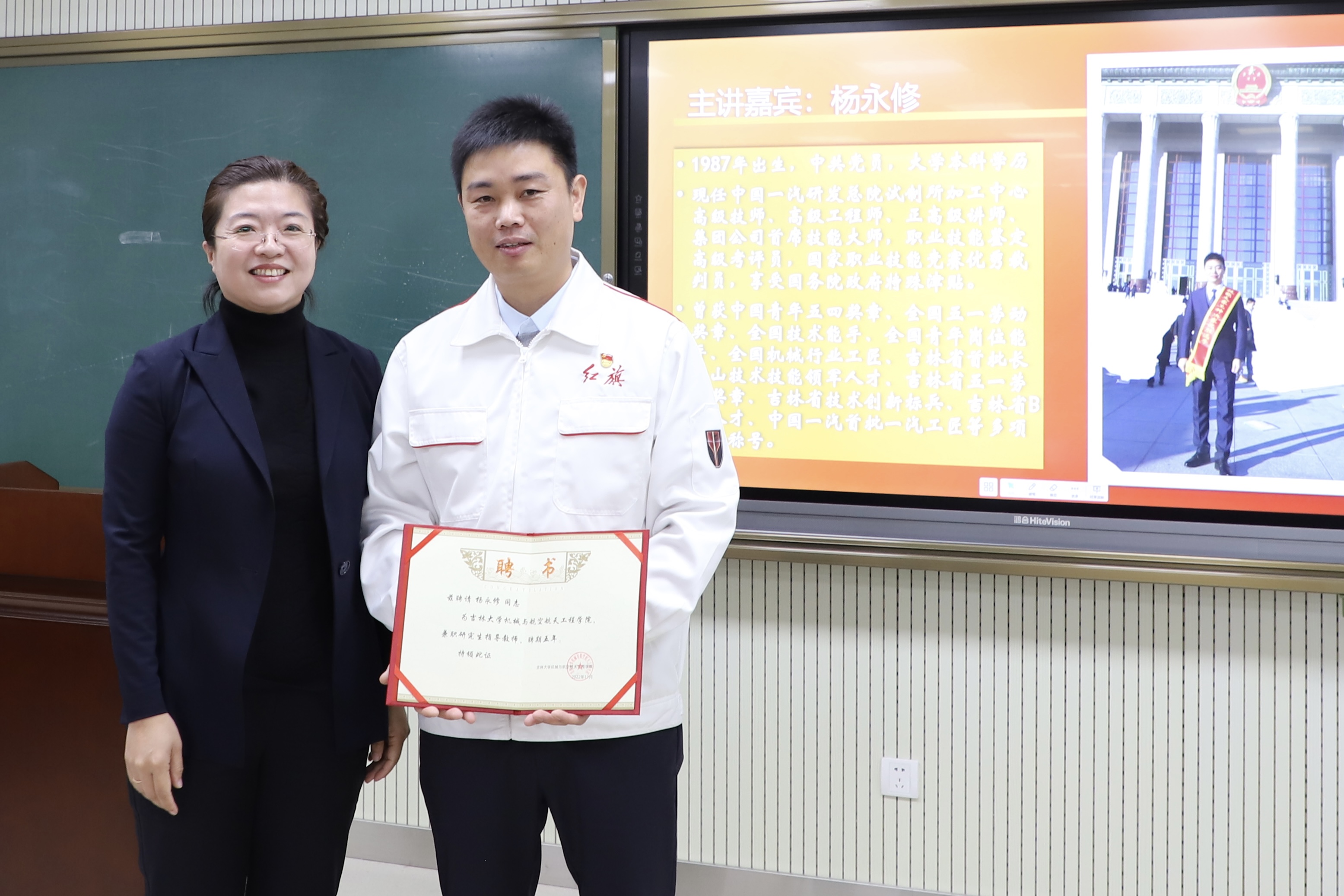 本次讲座以“秉承‘中国制造’心、践行‘工匠精神’魂”为主题,邀请“大国工匠”杨永修作报告。杨永修现任中国一汽研发总院试制所加工中心高级技师、高级工程师、正高级讲师、集团公司首席技能大师,职业技能鉴定高级考评员,国家职业技能竞赛优秀裁判员,享受国务院政府特殊津贴。学院党委书记郑福胜为杨永修颁发了学院“大学生思政导师”聘书,党委副书记黄莹为其颁发“兼职研究生指导教师”聘书。