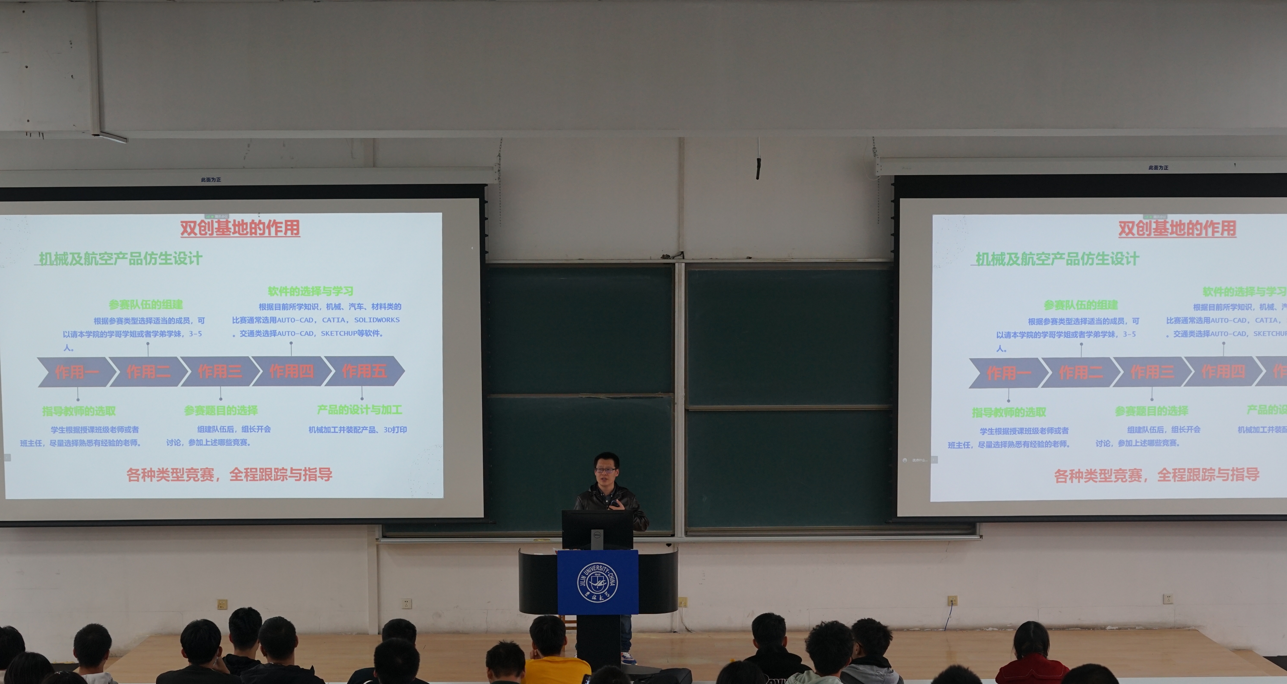 温志超、李浩、张国政、刘睿渊四位同学分别分享了双创比赛或成图大赛中的经历和体会,鼓励低年级大学生积极参加学科竞赛、参与创新创业实践活动,将理论学习与实践相结合,进一步提升个人综合素质。