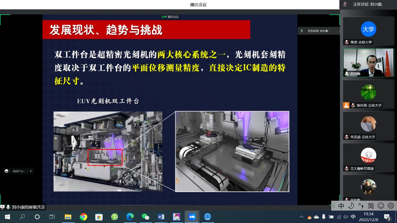 2022年12月9日晚上7:00,受吉林大学数控装备可靠性教育部重点实验室赵宏伟主任邀请,重庆理工大学副校长、机械工程学院院长、机械检测技术与装备教育部工程研究中心主任、国家杰出青年基金获得者刘小康教授面向实验室师生作了题为“超精密时栅测量与量子位移传感技术”的线上学术报告。讲座由重点实验室副主任黄虎教授主持,实验室、学院师生以及部分校外学者70余人参加了此次学术交流活动。
