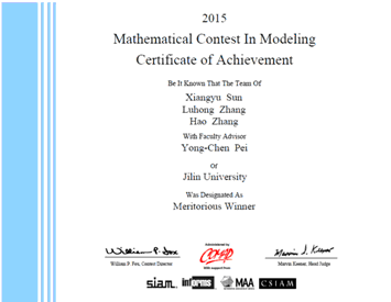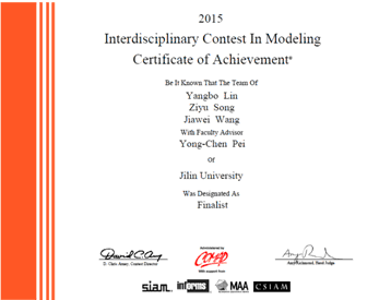 2015年美国大学生数学建模竞赛(MCM/ICM)于2015年2月6日至10日举行。机械学院裴永臣副教授指导的我院孙翔雨、张鲁宏、张皓代表队荣获一等奖(Meritorious Winner),林垟钵、宋子钰、王佳炜代表队荣获2011年以来吉林大学唯一一个特等提名奖(Finalist),是机械学院目前在数学建模竞赛方面取得的最好成绩。