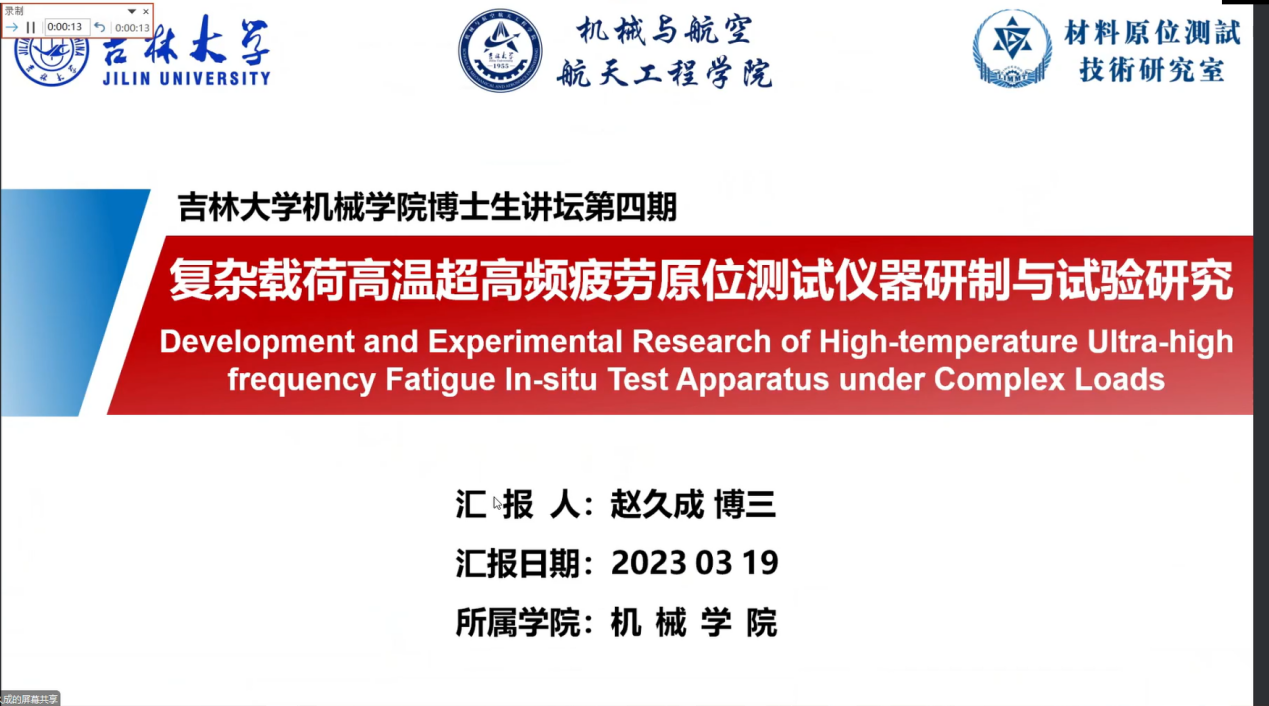 为提升我院研究生科研素养,激发同学们的科研热情,帮助大家广泛地掌握学科发展前沿信息,2023年3月19日20:00,新葡的京集团8814研究生管理办公室举办了第四期“‘吉’思广益,‘博’引学途”云端博士生讲坛系列交流分享会。本次会议特邀2020级博士生赵久成,就“复杂载荷高温超高频疲劳原位测试仪器研制与实验研究”主题开展交流报告。