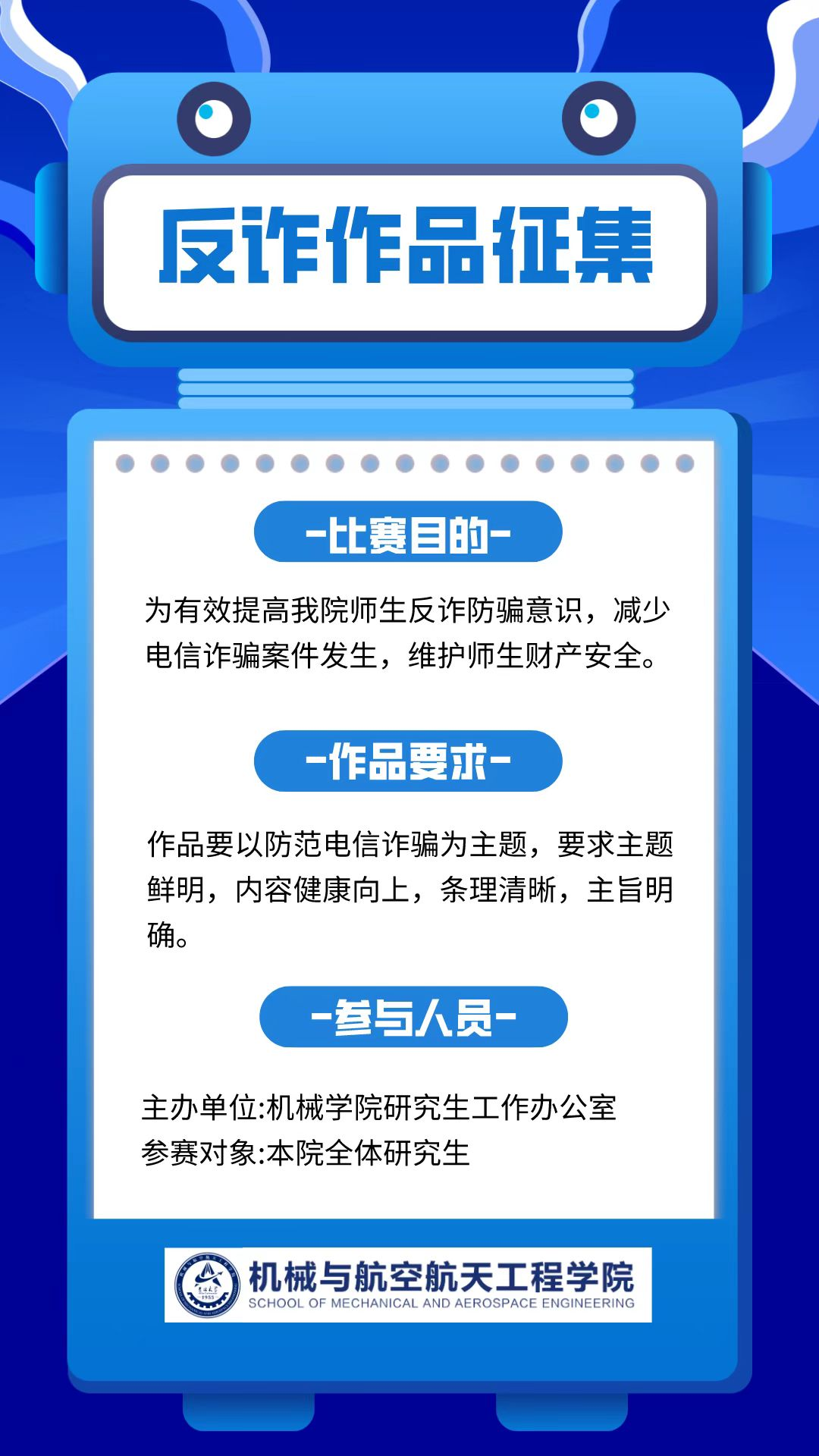 为落实学校防范电信诈骗相关工作,有效提高我院研究生反诈防骗意识,减少电信案件发生,机械与航空航天学院于4月13日至4月16日以“防范诈骗擦亮眼,拒绝诱惑心不贪”为主题开展反诈作品征集活动。