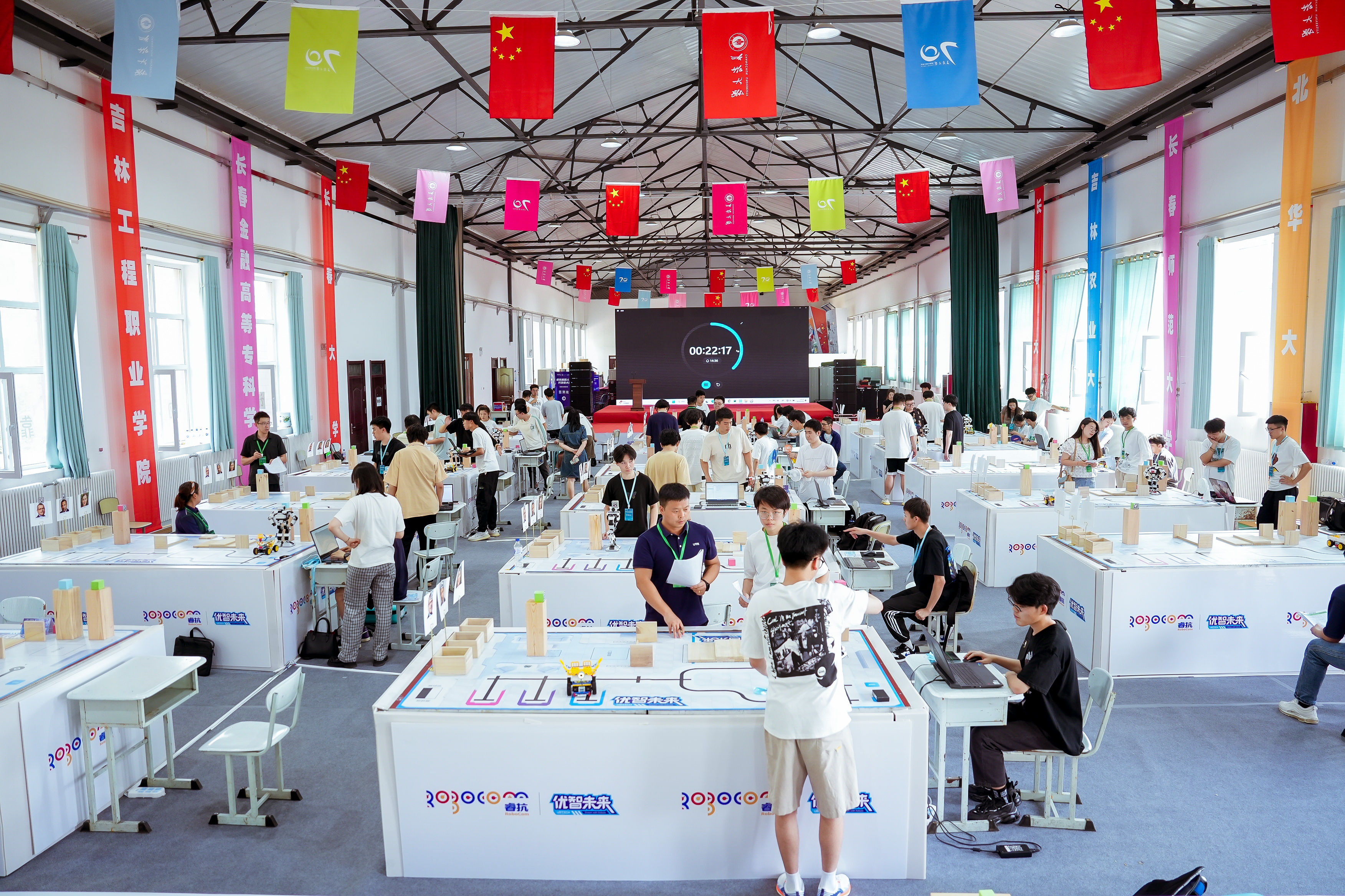 在长春大学分赛场,优智未来赛项的选手们现场调试人形机器人和车型机器人,在特定地图上完成了“人车协作”、“障碍穿越”、“物品递送”等多项任务。