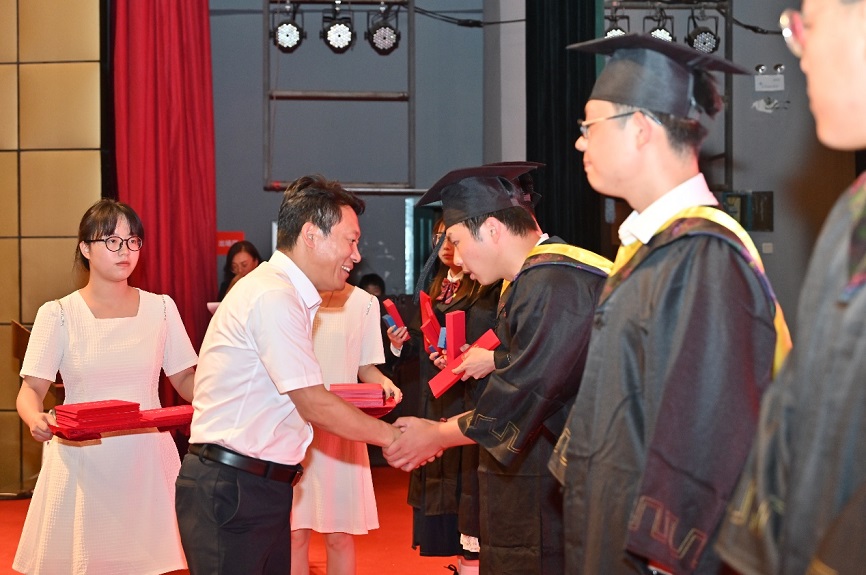 院党委书记郑福胜为优秀毕业生代表颁发荣誉证书及毕业纪念章。