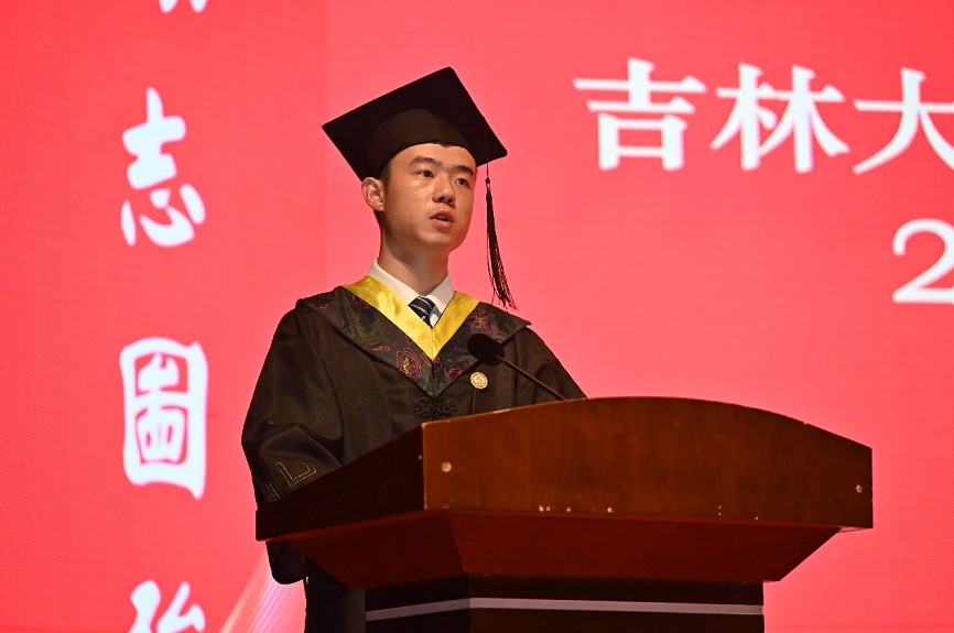 毕业生代表龚雨寒同学发言,他分享了四年大学生活的感悟,并对母校、学院、老师和同学们表达谢意和祝愿。