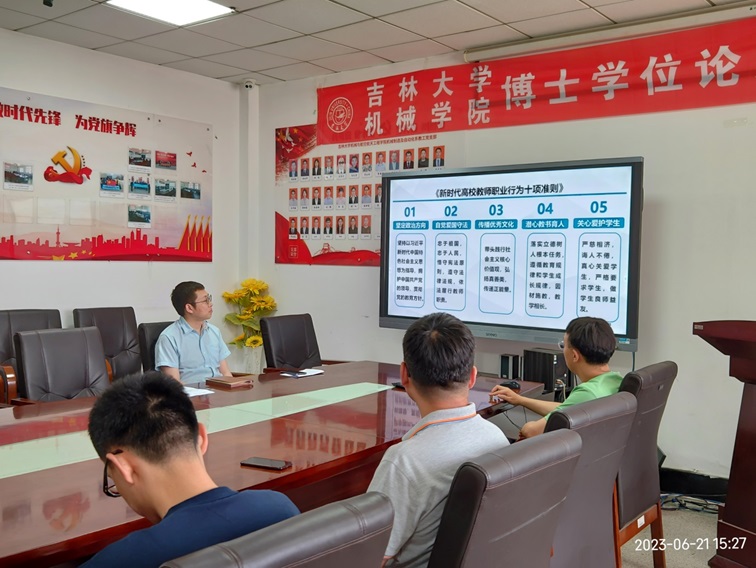 2023年6月21日下午,按照教育部《关于在教育系统开展师德集中学习教育的通知》和吉林大学《关于在全校开展师德集中学习教育的通知》要求,为深入学习习近平新时代中国特色社会主义思想,贯彻习近平总书记关于教育的重要论述和指示批示精神,坚决落实师德师风第一标准,把握师德师风建设工作面临的新形势新要求,全员全方位全过程强化师德养成,压实师德师风建设责任,严肃查处师德违规行为,引导广大教师敬业立学、崇德尚美,营造风清气正的育人环境,机械制造及自动化系全体教师和实验室人员开展了师德集中学习教育活动。