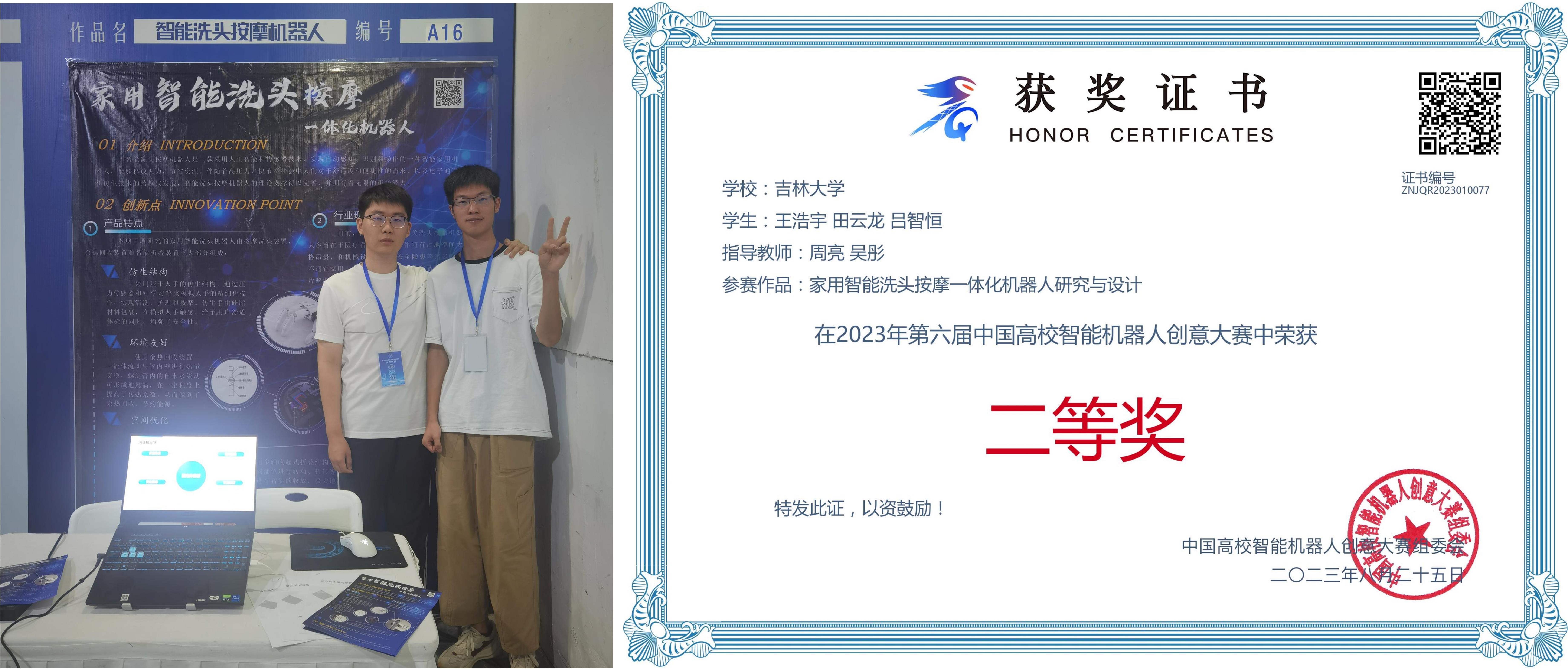 王浩宇、田云龙、吕智恒以“家用智能洗头按摩一体化机器人研究与设计”为题勇夺家用智能机器人无实物组全国二等奖。
