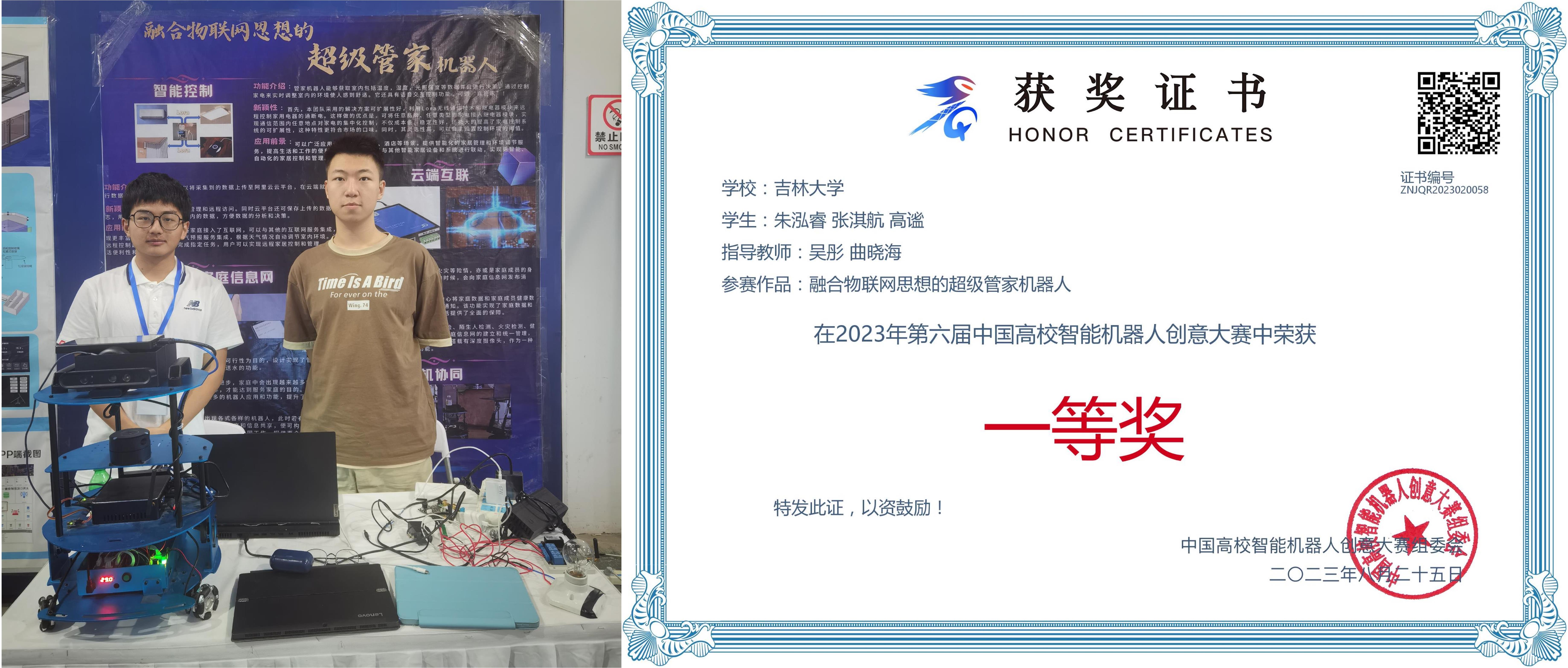朱泓睿、张淇航、高谧以“融合物联网思想的超级管家机器人”为题勇夺家用智能机器人有实物组全国一等奖。
