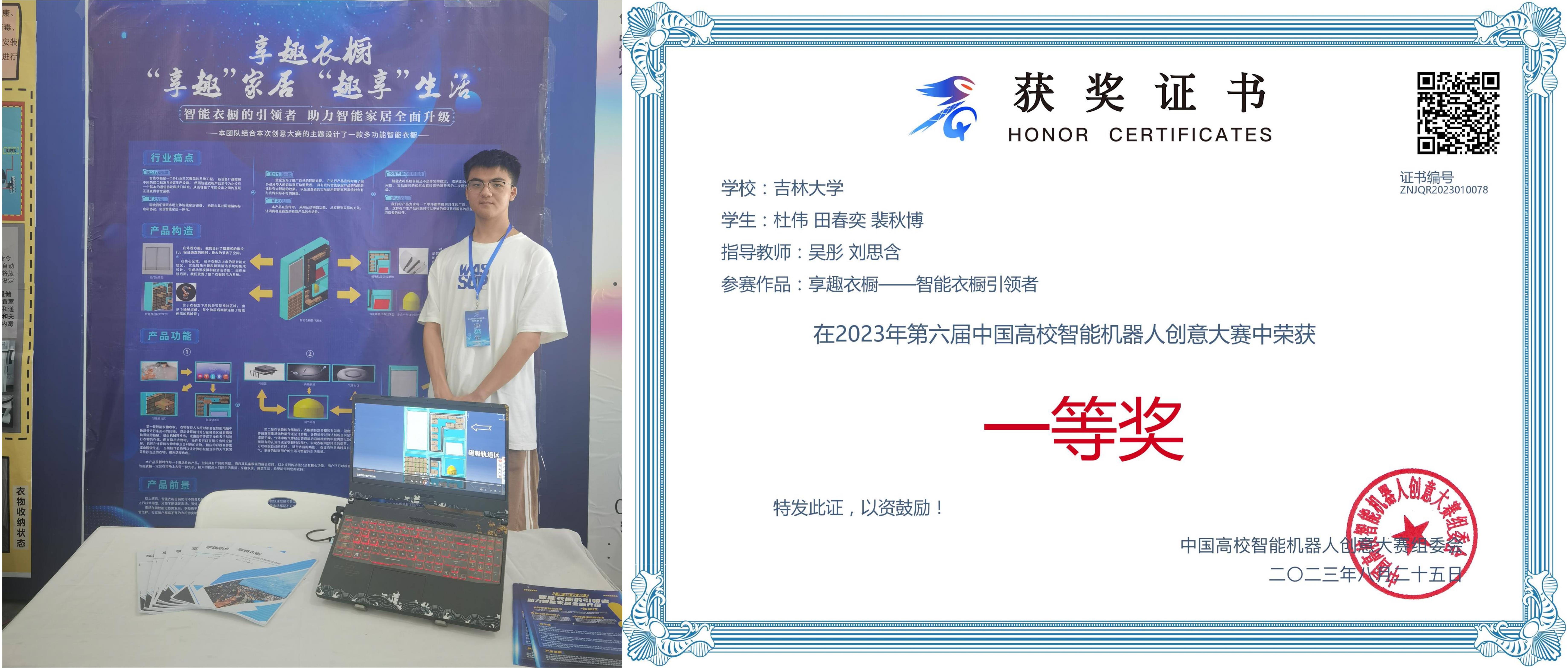 杜伟、田春弈、裴秋博以“享趣衣橱——智能衣橱引领者”为题勇夺家用智能机器人无实物组全国一等奖。