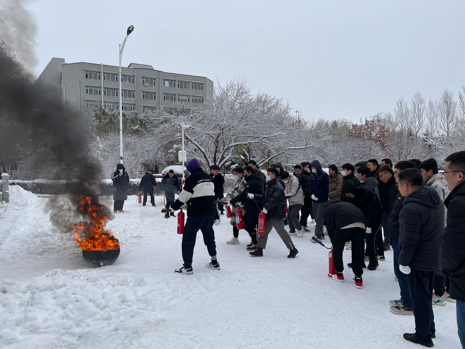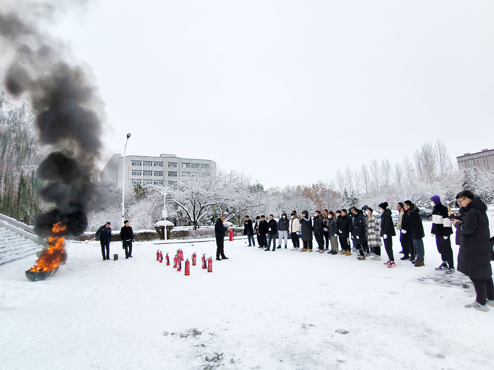 随后,学院副院长马研、左文杰及师生代表参加了消防疏散演练。在东区保卫办刘海江的指导下,在场师生迅速、有序地按照疏散路线撤离至室外安全区域。在室外,王中刚讲解了干粉灭火器的使用方法,并进行了现场演示。现场师生兴趣盎然、踊跃参与灭火实操。演练过程中,王中刚老师还针对同学们距离火源过近、未指向火焰根部等问题进行了指导。