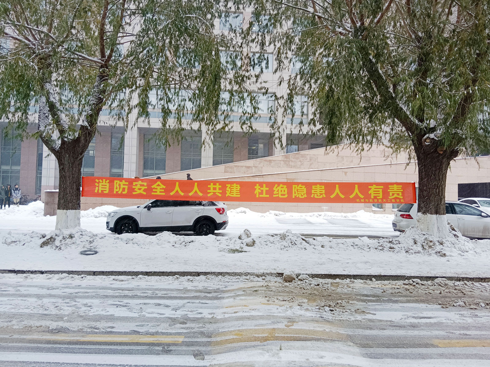 此外,学院还在机械材料馆和逸夫教育大楼前悬挂消防标语横幅,营造出浓厚的消防宣传氛围,提醒师生时刻保持消防安全意识。
