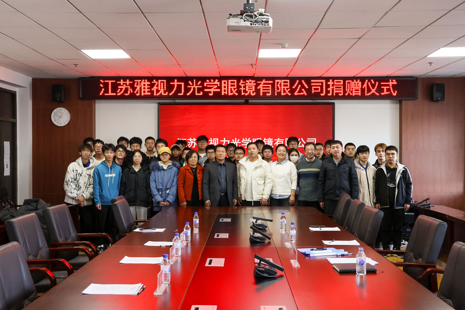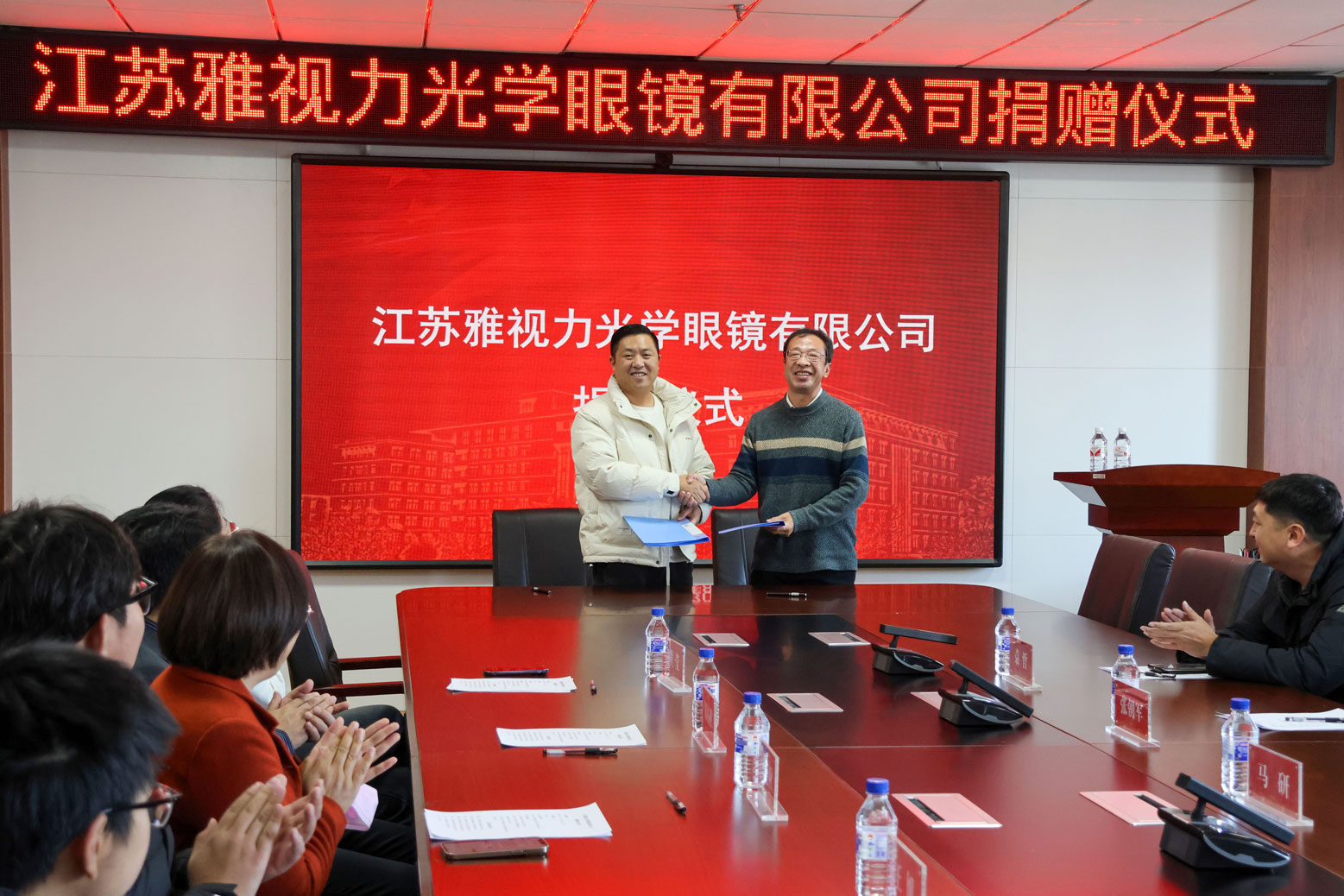 副院长、学院工会主席马研简要介绍了“眼镜之都”丹阳的情况以及校企双方合作的背景,并代表学院工会与江苏雅视力光学眼镜有限公司签署捐赠协议。