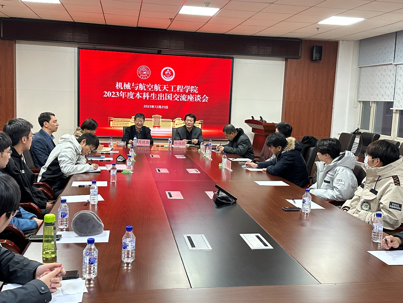 为帮助有出国(境)意愿的毕业生进一步明确发展目标,科学规划未来学业发展方向,加强学生与学院的沟通和联系,12月25日下午16:00,我院在机械材料馆527会议室举办了2024届拟出国(境)毕业生座谈会暨“院长/书记有约”活动。院长周晓勤、党委书记郑福胜、副院长王继新、吴文征出席座谈会,并邀请朱航、刘坤、刘永亮三位有海外留学经历的教师为学生答疑解惑。活动由院党委副书记兼副院长马艳秋主持。