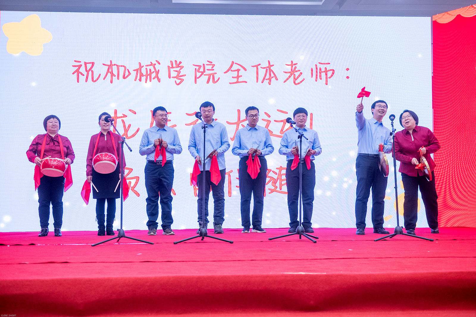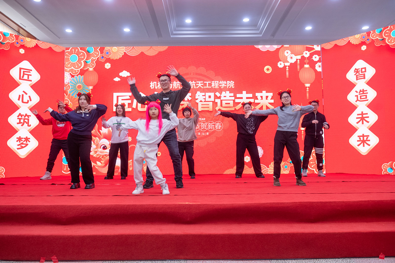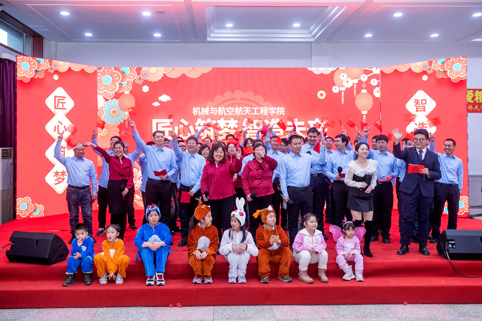 表彰大会结束后,新年联欢会正式拉开帷幕,伴随着活力满满的歌舞串烧《把未来点亮》, “吉宝宝”欢快的舞蹈和嘹亮的歌声点燃了全场的激情。小提琴独奏《我爱你中国》以浓重的爱国之情感染整个会场;小合唱《真心英雄》以对生活的热爱诠释着普通人不平凡的“英雄”本色;舞蹈《可爱摆》,突破传统印象,展现了机械人的柔情与温情;电子琴独奏《彩云追月》以音乐之美展现了传统文化的独特魅力;舞蹈《生机勃勃》展现了生命旺盛的生机与活力;三句半《有缘才会相聚》以幽默风趣的表演风格,将学院日新月异、蓬勃发展的景象融入到曲艺中,赢得了阵阵喝彩;合唱《直到世界尽头》诉说着对梦想的追求和对未来的信念,充满着激情和力量;大合唱《相亲相爱一家人》凝结了全院教职工团结一致、携手前行的共同期盼。