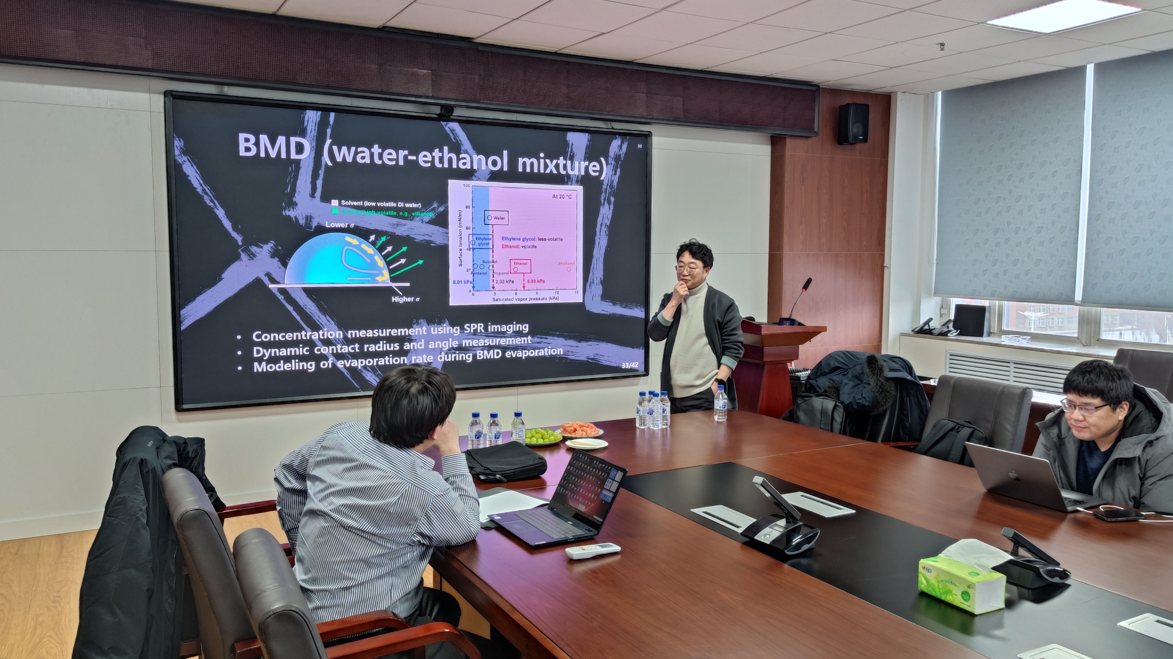 蒸发液滴阵列已被用于制造印刷电子产品的表面涂层。对蒸发过程中局部浓度的原位测量对于理解二元混合液滴(binary mixture droplets,BMD)内部与表面张力梯度密切相关的溶质Marangoni流运动至关重要。在讲座中,Lee教授介绍了BMD蒸发时选择性蒸发的定量分析,使用SPR成像来测量壁附近的浓度。Lee教授重点介绍了4个应用案例,包括霜状薄膜厚度测量、滴状冷凝的高速SPR成像、蒸发薄膜测量和最新的BMD浓度的原位测量。此外,Lee教授还展示了多个BMD接触线行为的动力学。