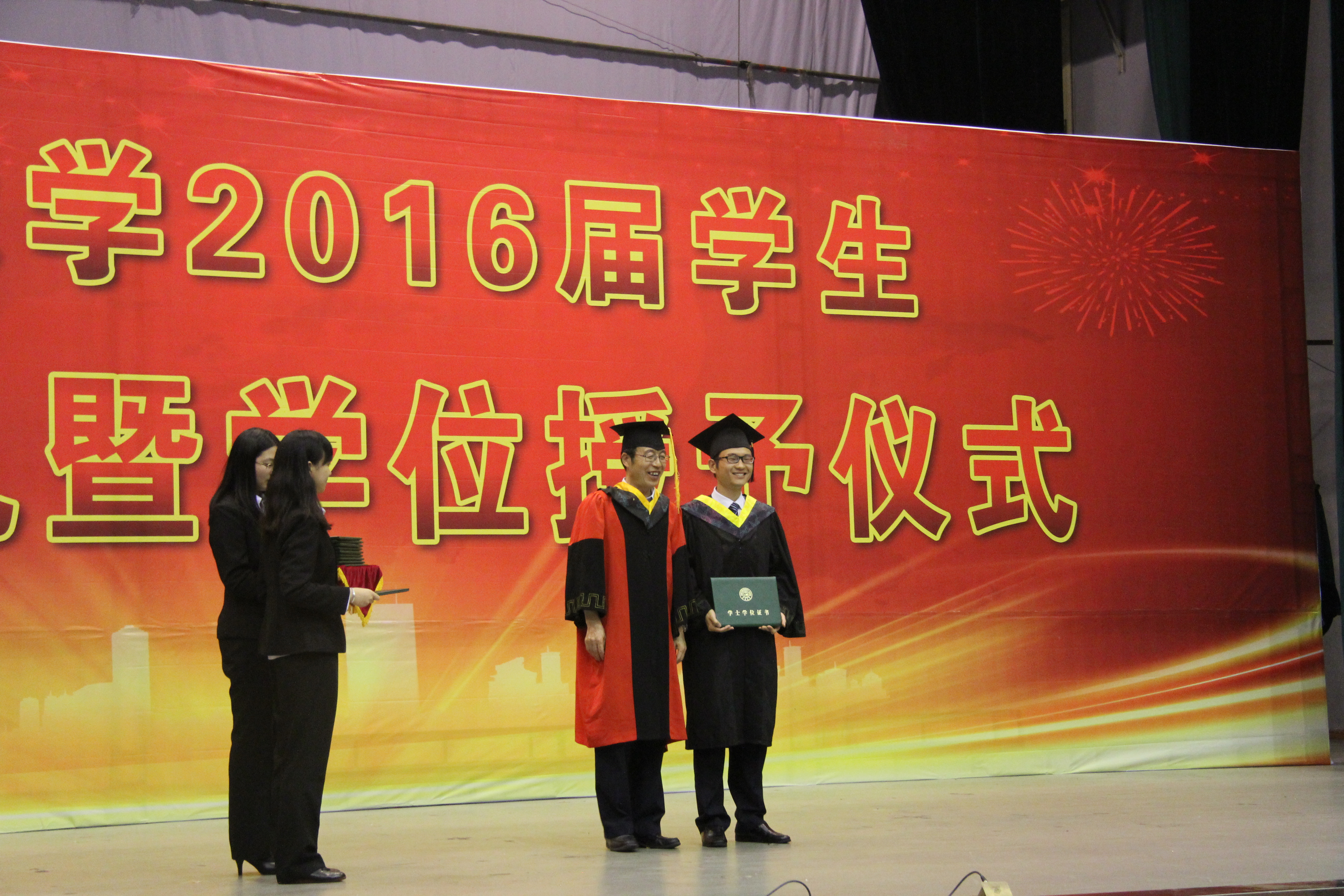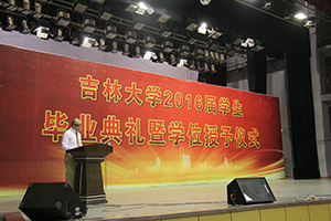 伴着铿锵有力的国歌,典礼正式开始,全体参会人员共迎这激动人心的时刻。副院长周晓勤宣读毕业生名单和获学士学位学生名单,学院党委副书记王柏宣读《吉林大学关于表彰2016届优秀毕业生的决定》。在悠扬的乐曲声中,学院学位评定委员会主席、院长杨兆军教授依次为22位优秀毕业生授予学位,随后,参会的学院学位评定委员会委员共同为其他毕业生授予学位并合影留念。