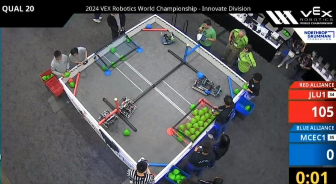 2024年的4月28日至30日,在美国德克萨斯州达拉斯市(Dallas)举办了2023-2024赛季的VEX机器人世界锦标赛。在这次世锦赛中,吉林大学第一代表队(JLU1)的温宇轩、叶彤等同学代表学校参加了比赛,他们在资格赛innovate分区中完成了九战六胜的好成绩,最终排名第22。虽然没能进入分区淘汰赛,但是作为一支第一次参与VEX竞赛项目就能够参加世锦赛的队伍,他们在这次比赛中积累了宝贵的经验,实现了吉林大学首次参加VEX机器人世锦赛的历史性突破!