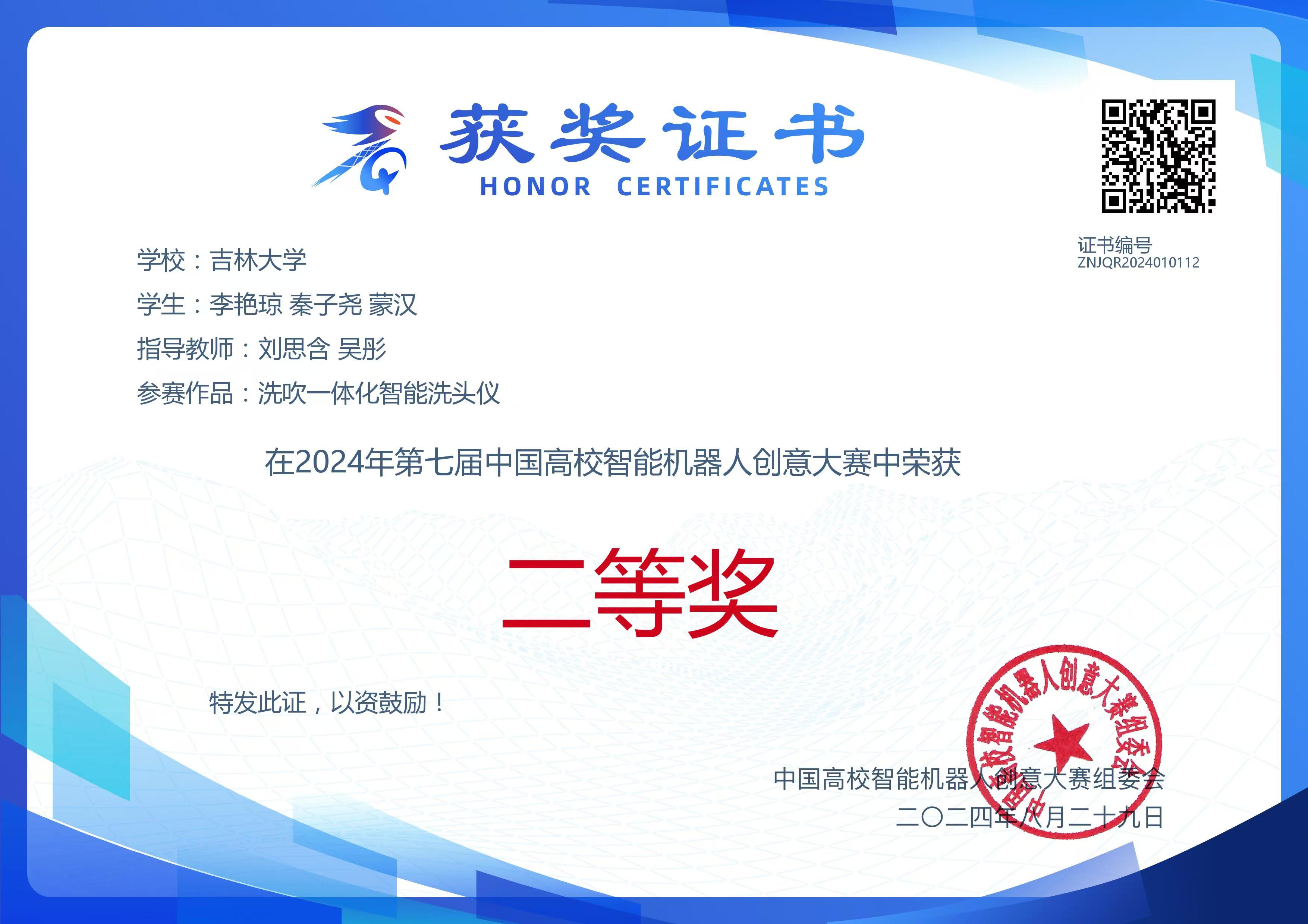 李艳琼、秦子尧、蒙汉的作品“洗吹一体化智能洗头仪”(指导教师:刘思含、吴彤)荣获全国二等奖。